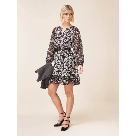 Mønstret kjole i lett viskose chiffon med fôr av viskose i kroppen. Kjolen har raglanerm med generøs vidde og smal knappet mansjett, stolpe med stofftrukne knapper i front, løst knytebelte i livet og utskrådd fasong med en kappe nederst på skjørtet. Liten logobadge i metall nede på siden. Modellen er 179 cm høy og har på seg str S.