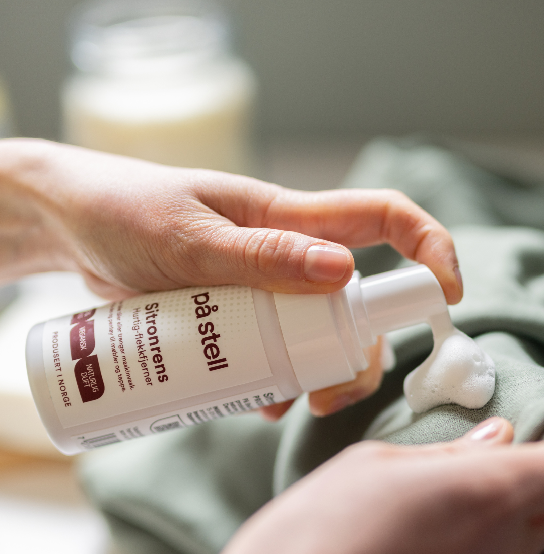 Har du fått en flekk? Ingen grunn til panikk – spray litt skum, gni forsiktig med fingeren og tørk av med en fuktig klut. I motsetning til sitronsåpen trenger dette skummet ikke virketid – det fjernes umiddelbart for å unngå at det trekker inn i stoffet.