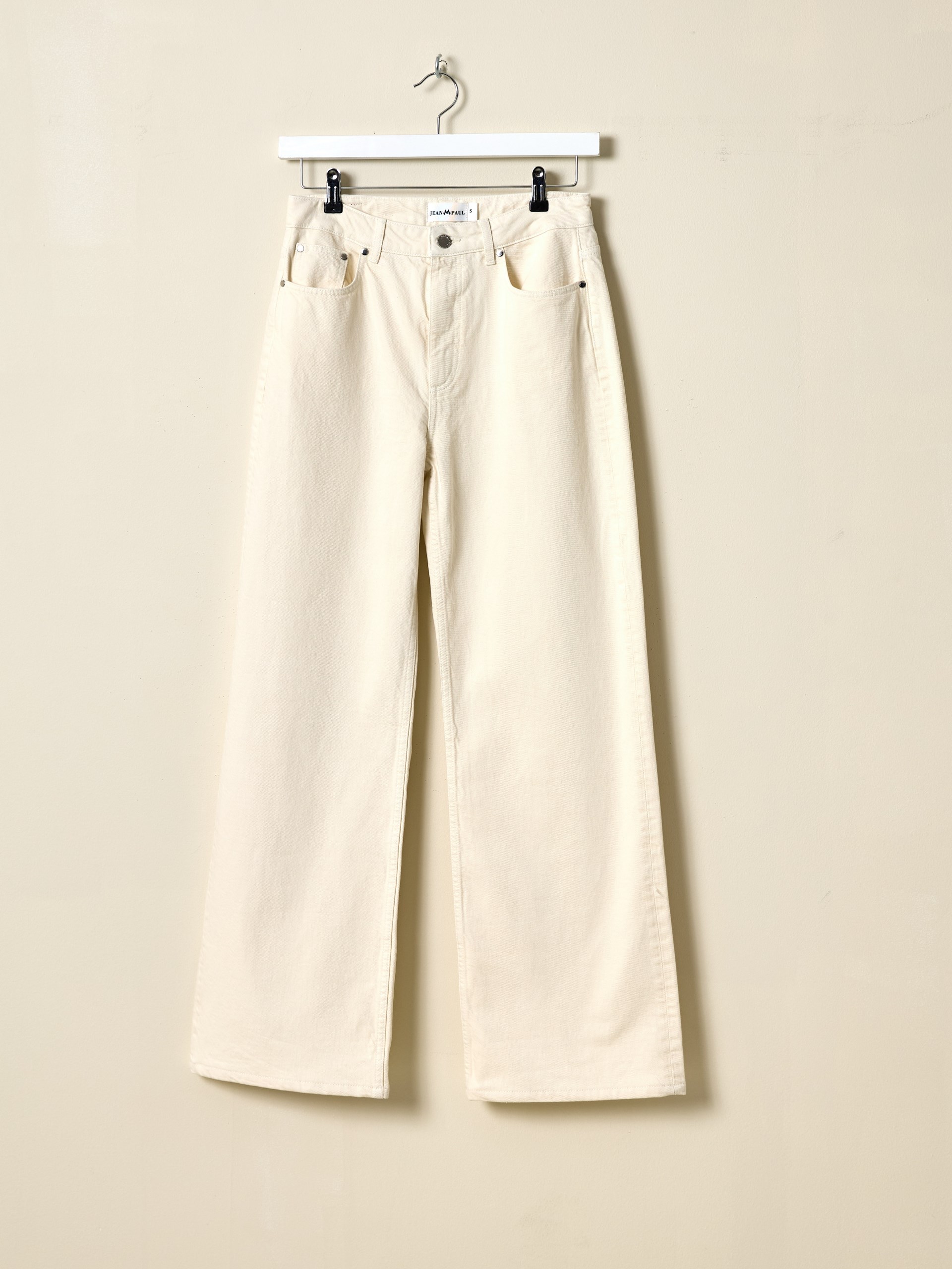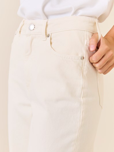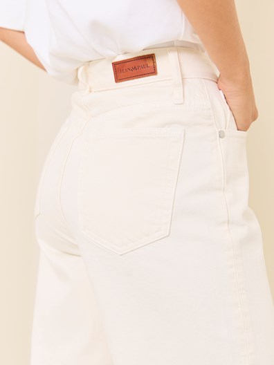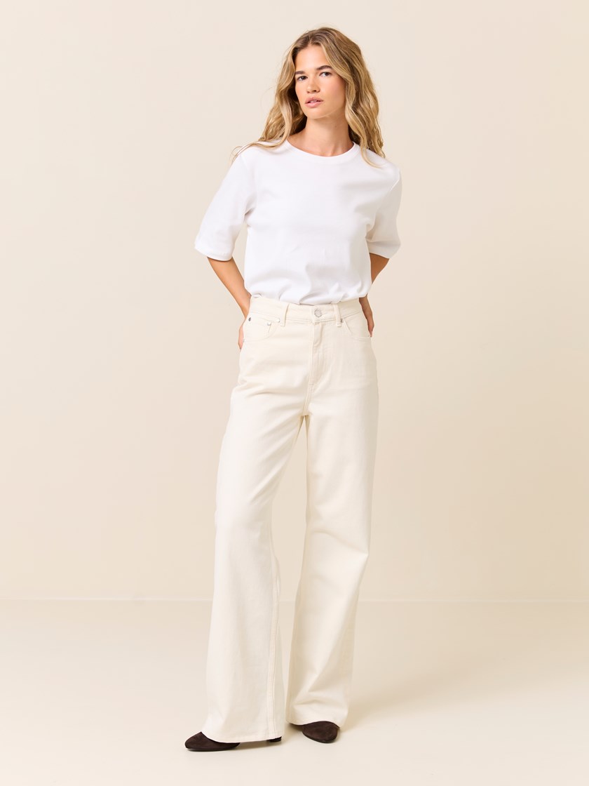 5 lommers jeans i bomullsdenim Jeansen har høyt liv, skinnetikett med logo i livet bak, klassiske jeansdetaljer og vide ben. Modellen er 170 cm høy og har på seg str S.