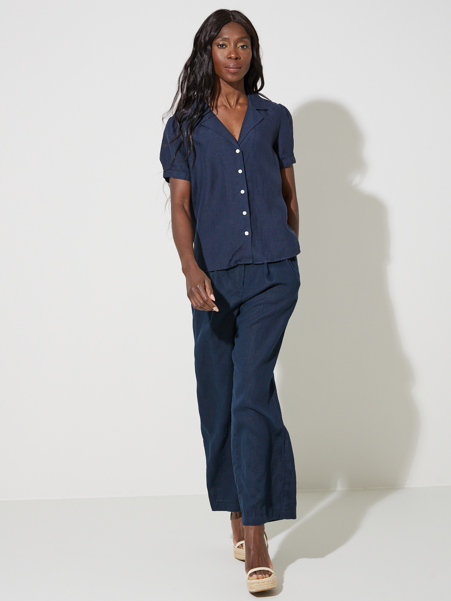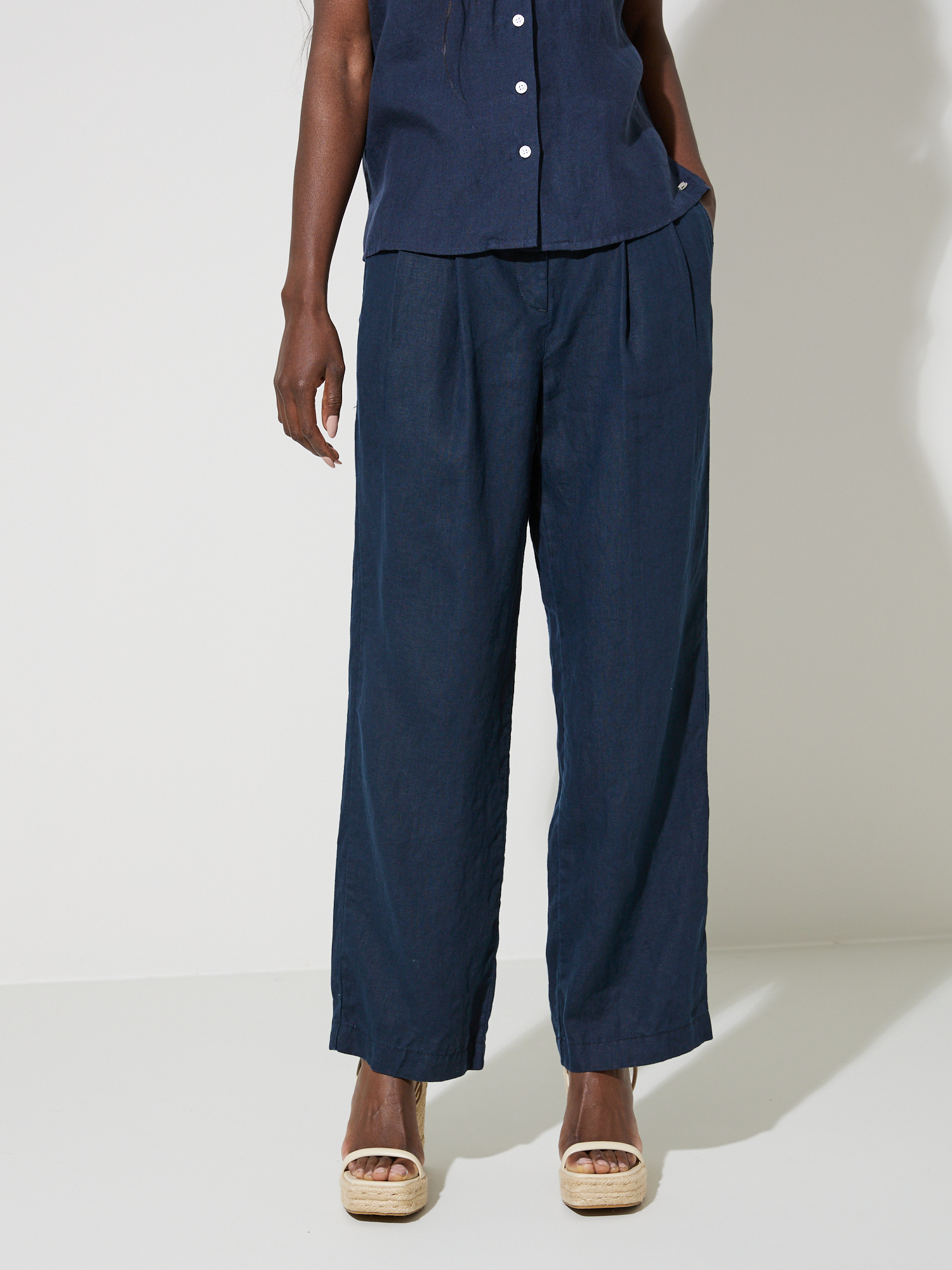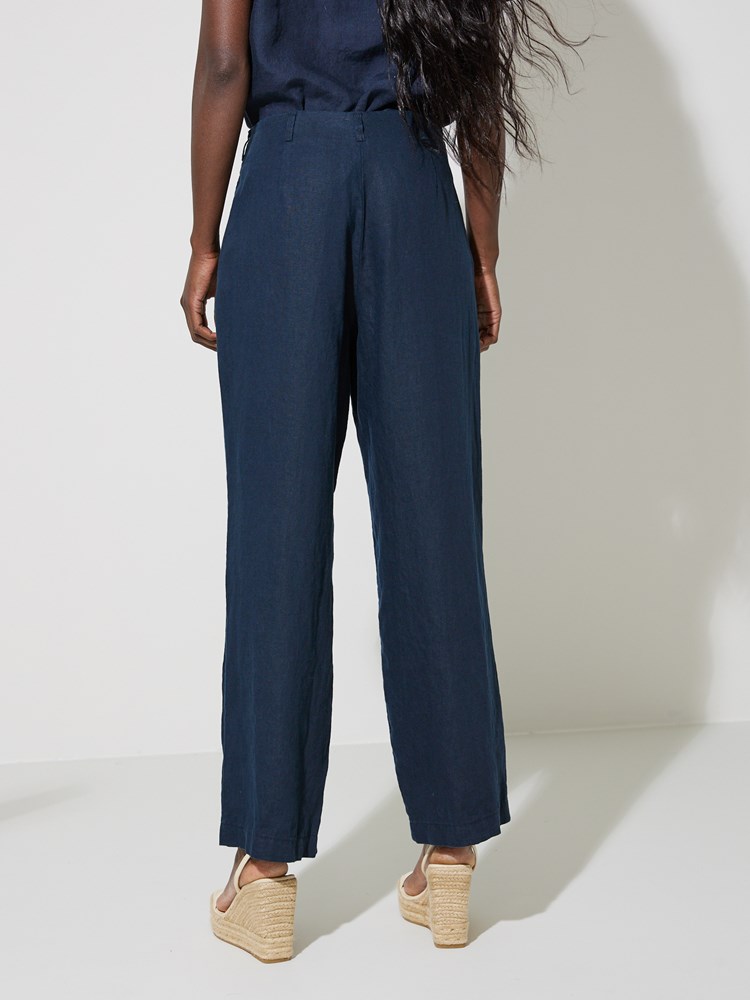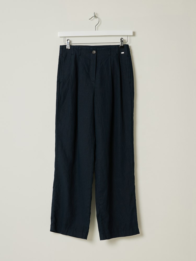 Sommerlig linbukse med enkel linning og beltestropper. Buksen har stikklommer, nedsydde legg i front, lukkes med knapp og glidelås, og har vide rette ben. Høyt liv og en liten logobadge i metall på hoften. Modellen er 177 cm høy og har på seg str S.