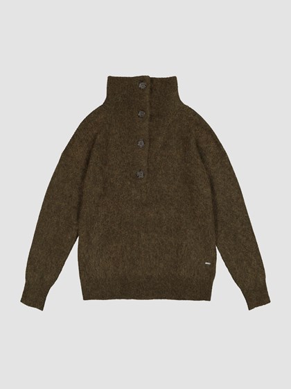 Myk og lun genser i behagelig ullblanding. Genseren har halvhøy krage med 4 hornfargede knapper, ribbestrikkede vrangborder og en liten logobadge i metall nede på siden.