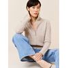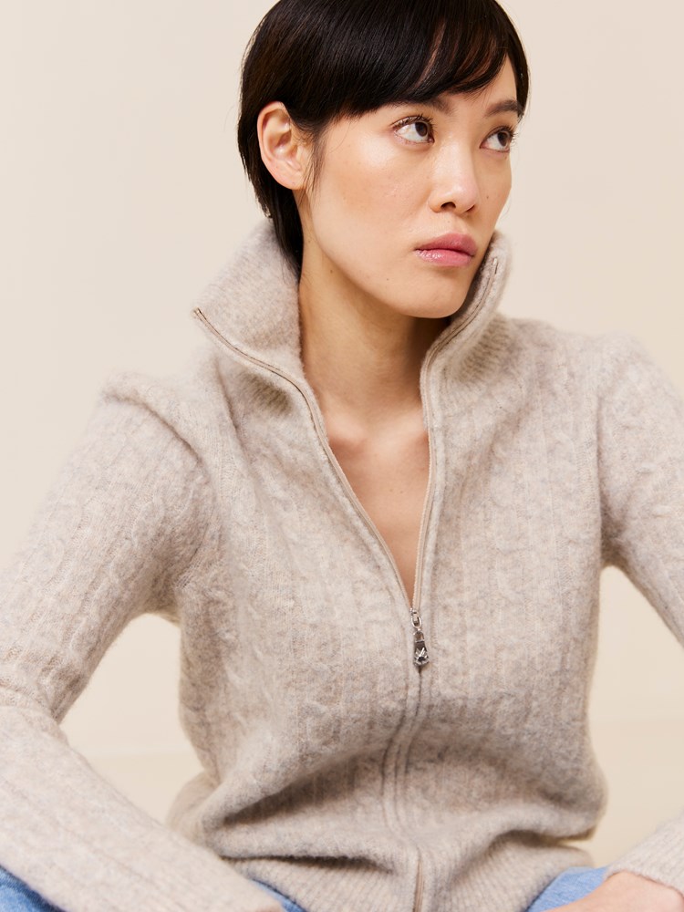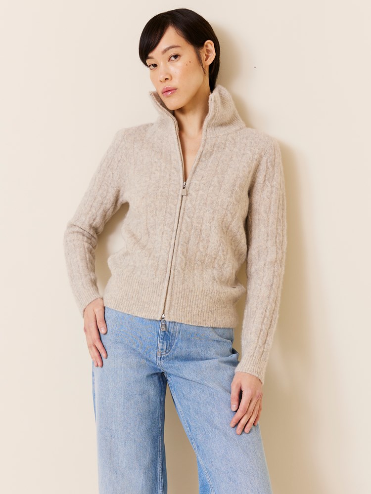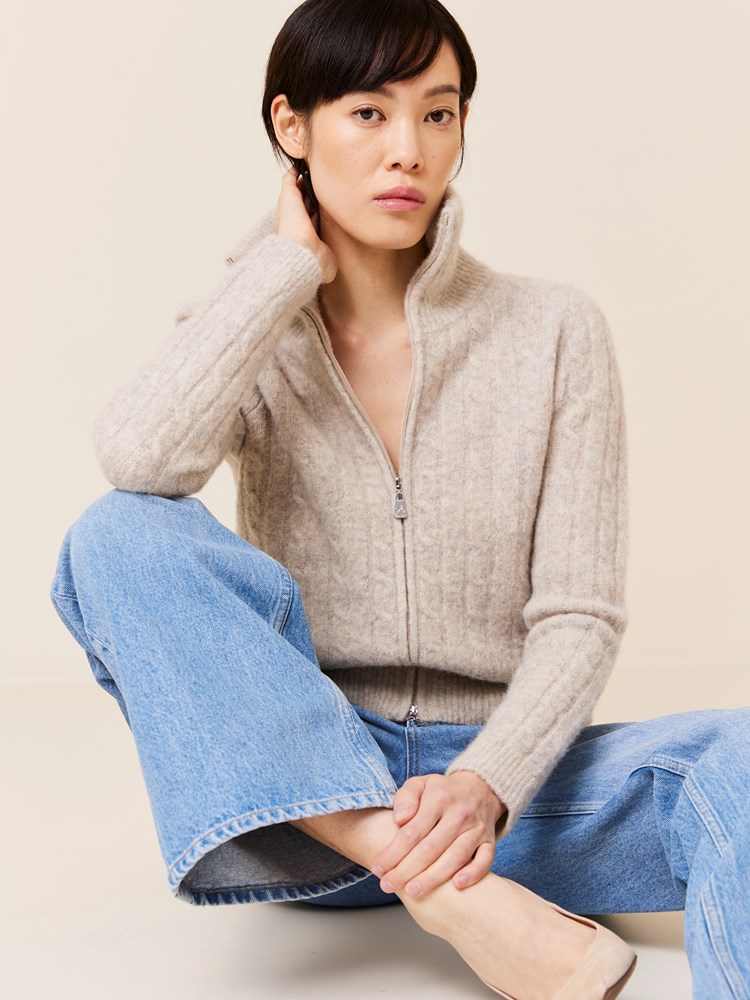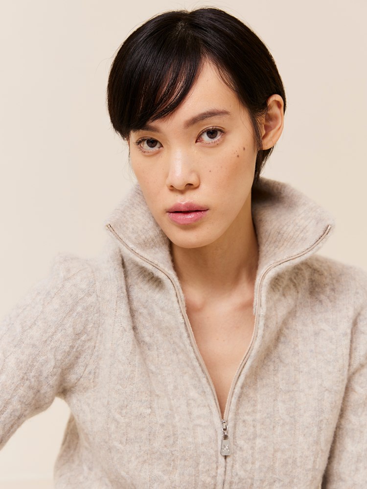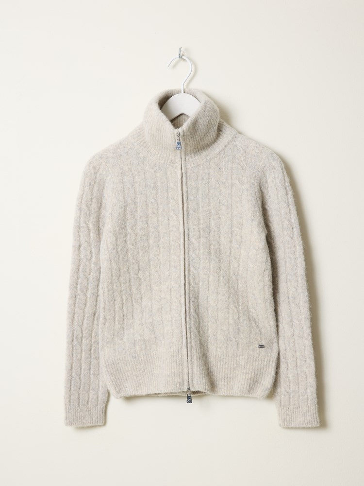 Myk flettestrikket cardigan i ull med forsterkende nylon og elastan for komfort. Cardiganen har høy ribkrage, metallglidelås i front, ribbestrikkede vrangborder og en liten metallbadge nede på siden. Rett kort passform. Modellen er 172 cm høy og har på seg str S.