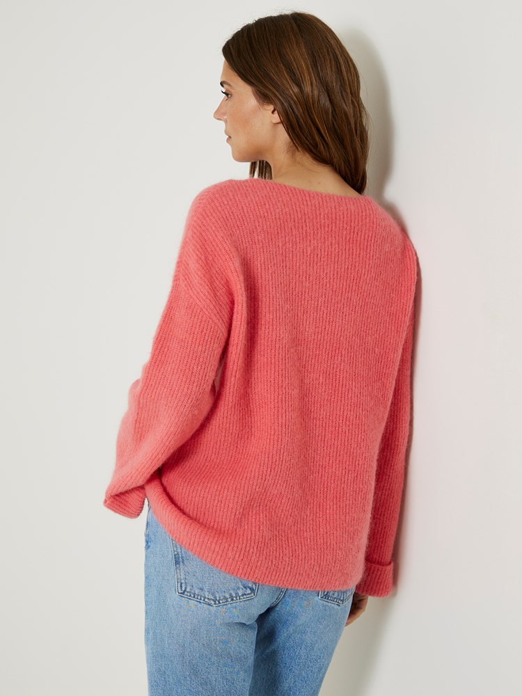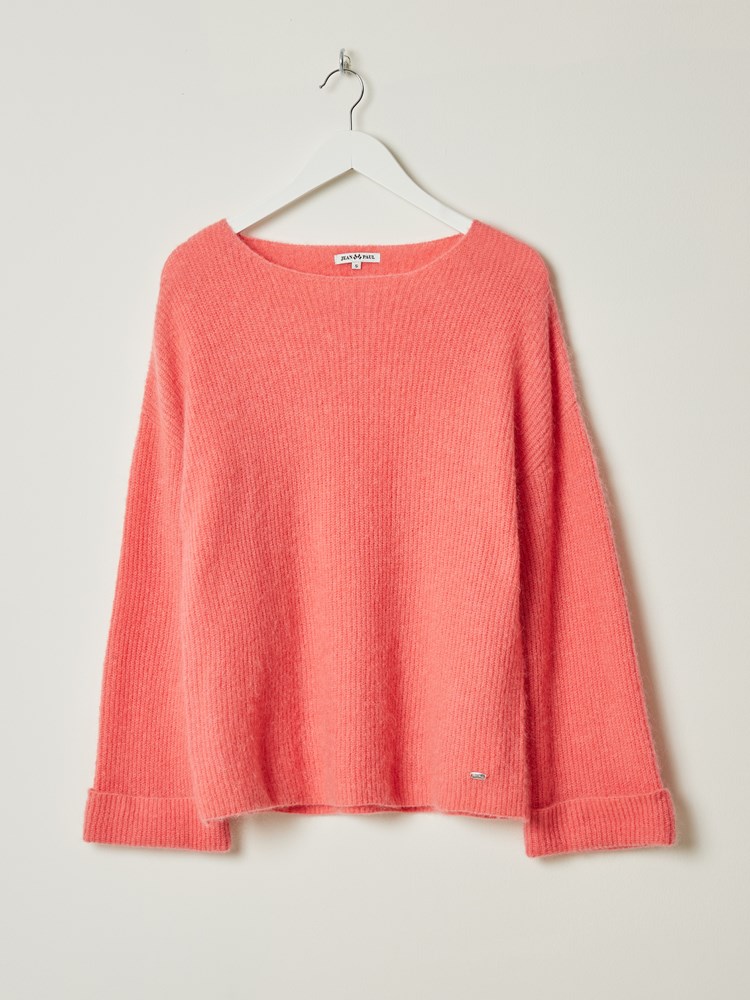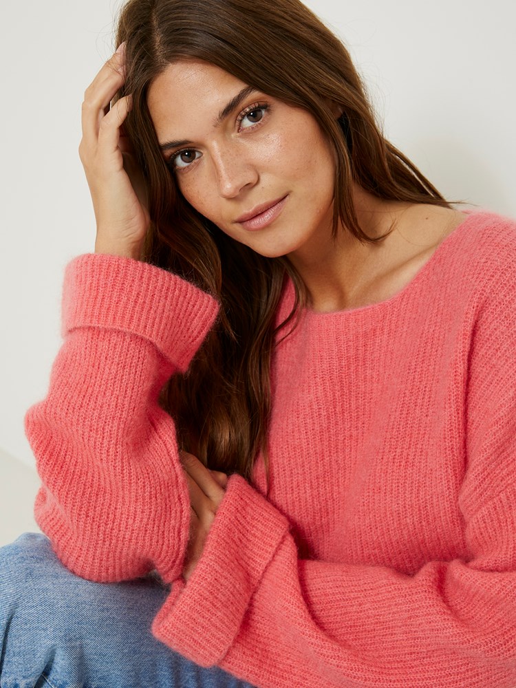 Ribbestrikket genser i lett og behagelig ullblanding med mohair. Genseren har rundet halsåpning, rett passform og lange ermer med vidde og oppbrett. Liten logobadge i metall nede på siden. Modellen er 173 cm høy og bruker str S.