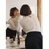 Ullblandet genser i feminin pointelle strikk med delikate heklede blondekanter og rund hals med knapp og splitt bak. rett passform. Modellen er 170 cm høy og har på seg str S.
