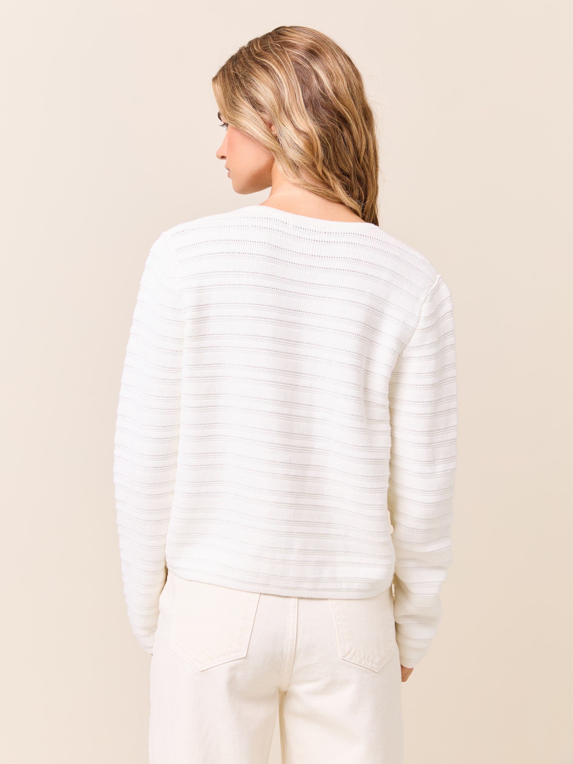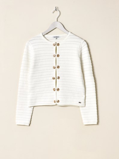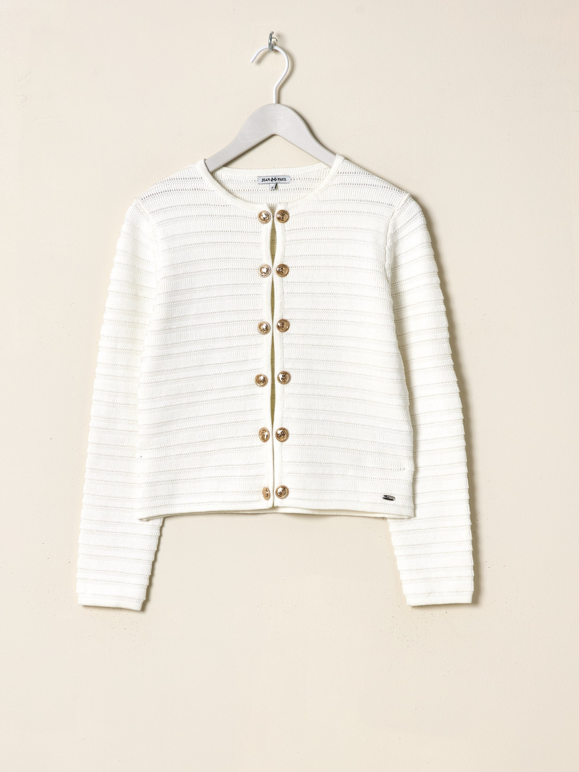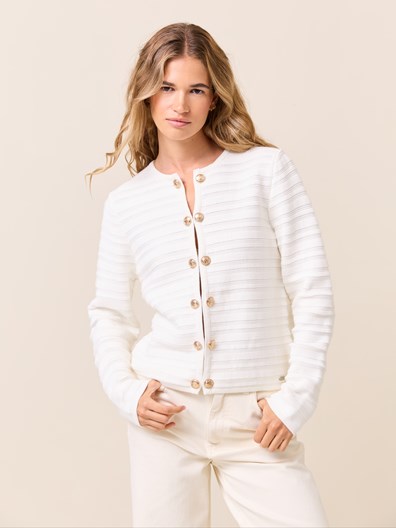 Strikket cardigan med stripestruktur i kort rett modell med hektelukning og dekorknapper i gullfarget metall i front. Cardiganen er i 100% behagelig bomull og har en liten logobadge i metall nede på siden. Modellen er 170 cm høy og har på seg str S.