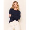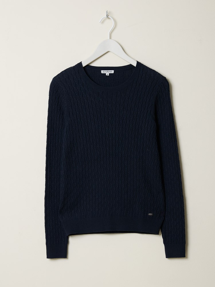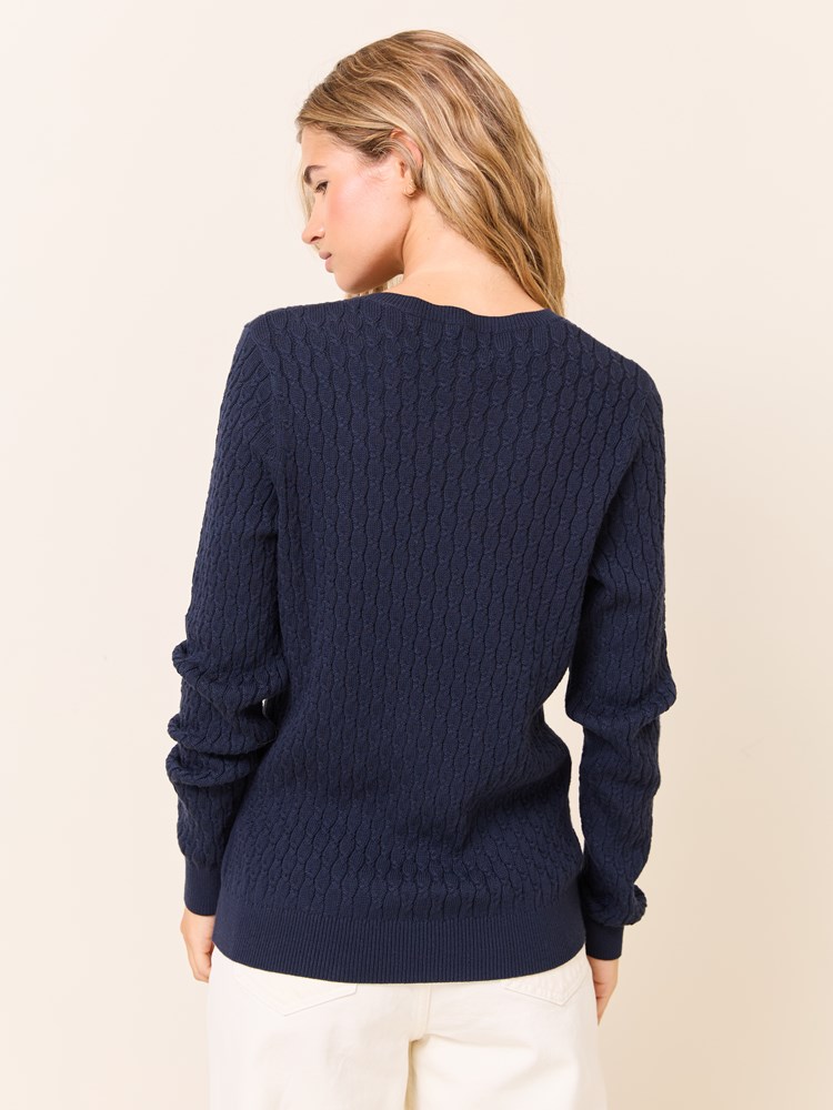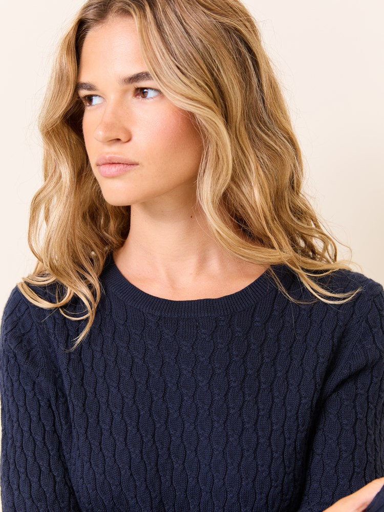 Kabelstrikket lett genser i 100% organisk bomull med rund hals, ribbestrikkede vrangborder og en liten metallbadge med logo nede på siden. Modellen er 170 cm høy og har på seg str S.