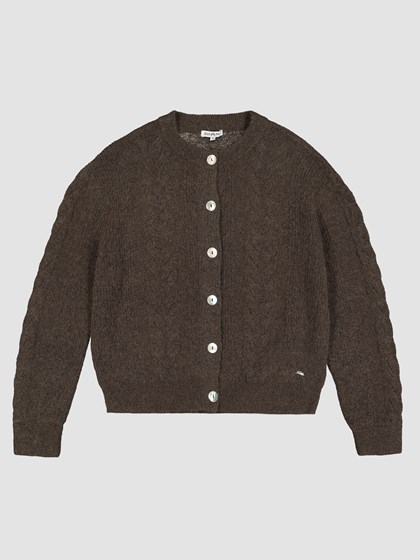 Delikat cardigan i lett og myk ullblanding med ribbestrikkede vrangborder. Cardiganen har flettestrikk i front og på ermene, rund halsåpning og knappestolpe med perlemorsfargede knapper. Liten logobadge i metall og normal passform.