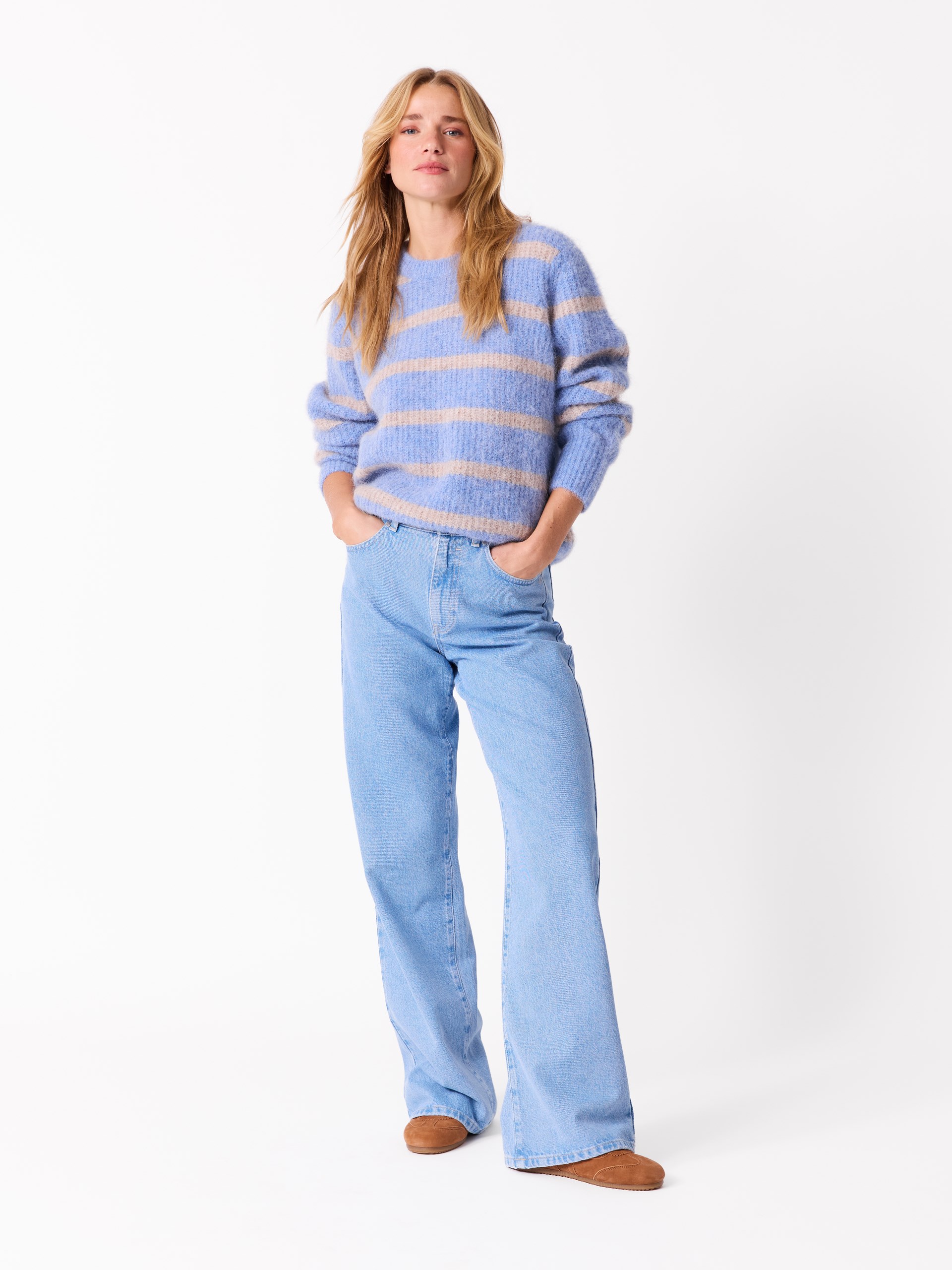 Myk patentstrikket genser i ullblanding med striper