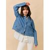 Feminin denimjakke i kort vid modell med bærestykke og rynker bak. Jakken har krage og lukning med denimknapper i front, knapp på lommene og rette ermer.