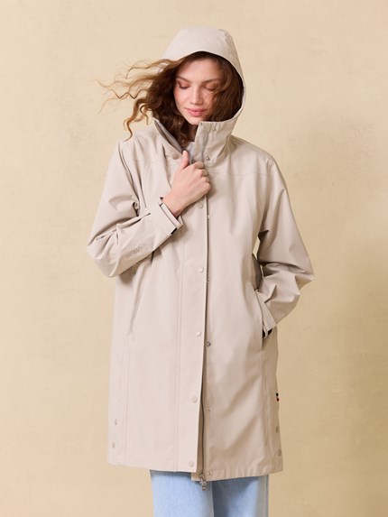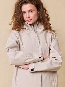 Allsidig regn- og allværsjakke i eksklusivt mykt ytterstoff med 10000 mm vannsøyle og 10000 mvp pusteevne med matchende meshfôr, innvendig snøring i livet og feminine splitter med trykknapper i siden. Den lette og komfortable jakken har hette, to gode ytterlommer med glidelås, en diskret glidelåslomme langs fronten, knappestolpe med matchende trykknapper og 2 way glidelås i front, en god innerlomme. Nedfellbare reflekser nederst i siden, metallbadge og ton i ton logobroderi på ermet, rett ermavslutning og regulerbar stropp med velcro på ermet.