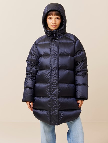 Lun og varm lang dunjakke i 90/10 dun og fjær med 650 cuin dunspenst og materialerer av 100% resirkulert nylon i både ytterstoff og fôr. Jakken har hette med regulering, raglanerm med innvendig elastisk mansjett., vertikale glidelåslommer og lukkes i front med glidelås og usynlige trykknapper i stolpen. En innerlomme og ton i ton gummibadge på ermet. Modellen er 167 cm høy og har på seg str S.