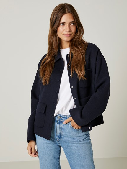 Kort rett jakke i delikat two faced ullblanding med krage og lukning med skjulte trykknapper og stofftrukne dekorknapper langs stolpen i front. Jakken har dropshoulder passform med rette ermer, to klaffelommer samt en brystlomme i front og en liten metallbadge med logo nede på siden. Modellen er 173 cm høy og bruker str S.