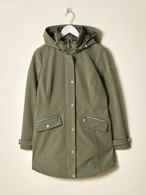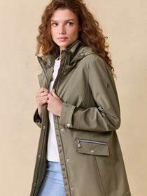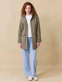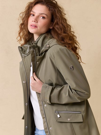Urban vindtett fritidsjakke i behagelig vindtett og vannavstøtende stretchmateriale med innvendig nylonfôr. Jakken har en feminin lett innsvinget passform, spensel i ryggen og regulering med hempe og knapp på ermet. Lukkes med glidelås og knappelukning, 2 doble frontlommer, en med glidelås og en med knapp og klafflomme. Innerlomme. Avtagbar regulerbar hette og krage med lett vattering samt solid nakkehempe i tricolorefarge. Logobadge i metall på ermet. Modellen er 170 cm høy og har på seg str S.