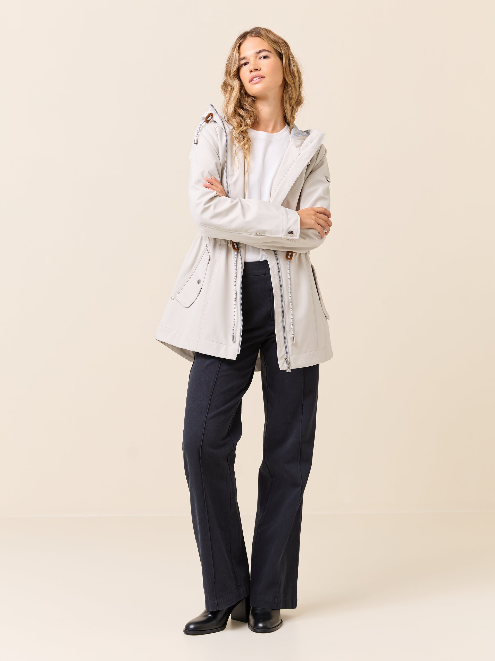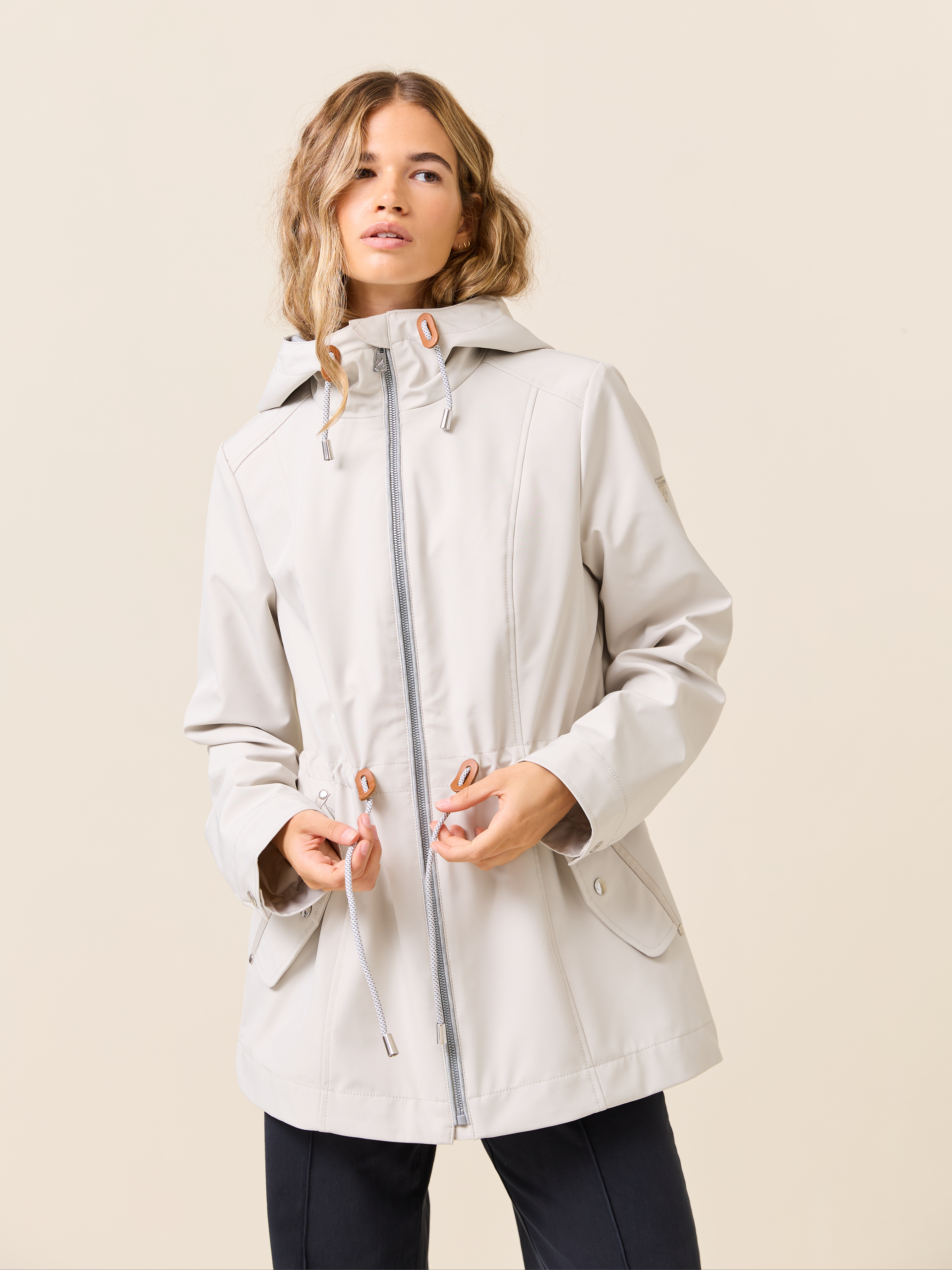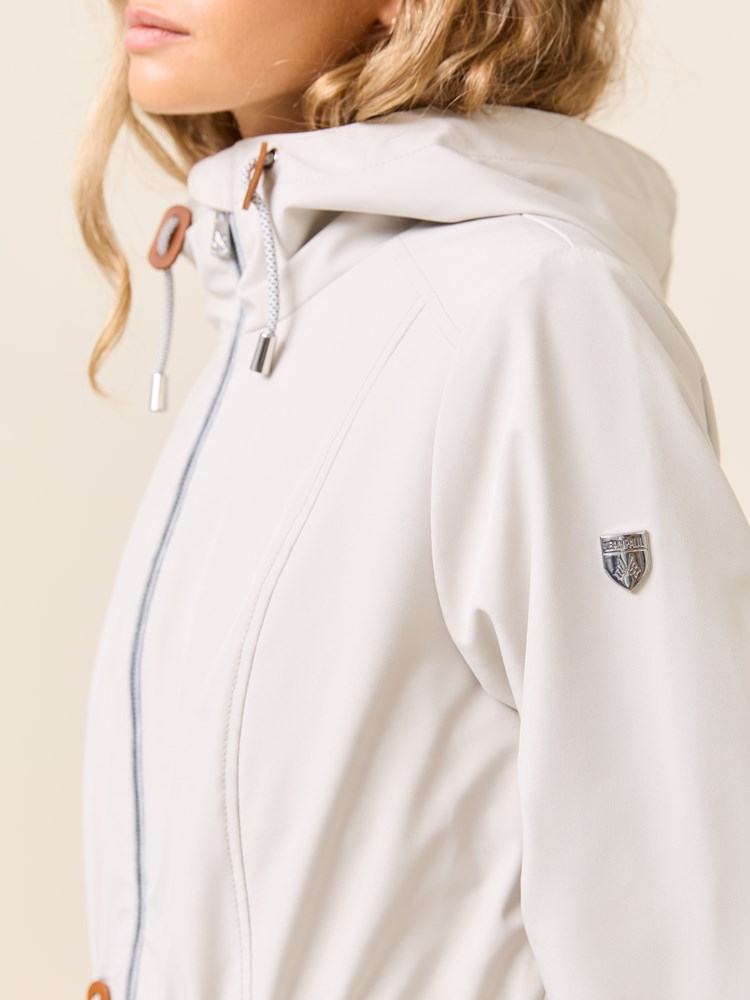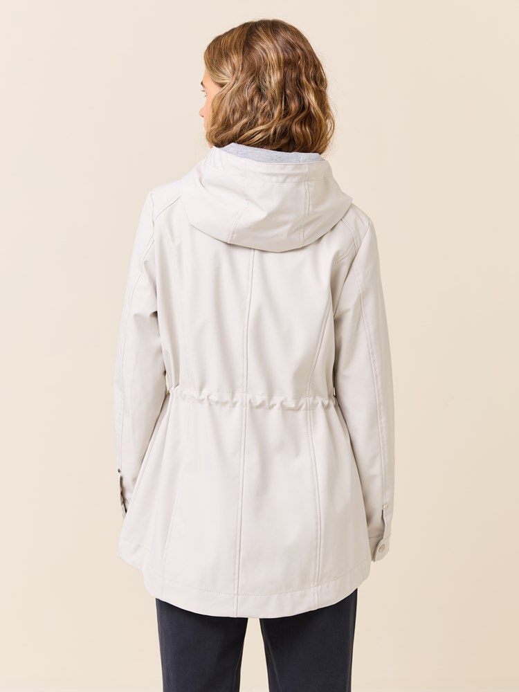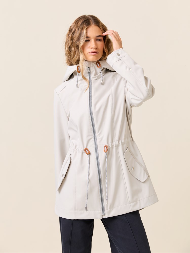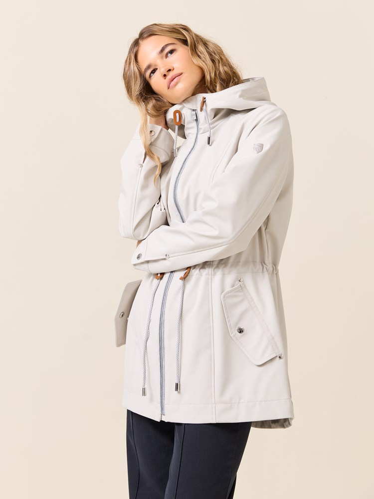 Jakke i myk kvalitet med 3000 mm vannsøyle og 3000 mvp pusteevne med ton i ton fôr, og regulerbar hette med mykt melert jerseyfôr Jakken har en innerlomme, to gode klaffelommer i front. knapp på mansjetten, og snøring med fine detaljer i livet. Kraftig nakkehempe og logobadge i metall på ermet. Modellen er 170 cm høy og har på seg str S.