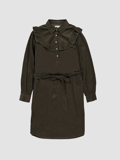 Feminin rett kjole i lett babycord med frontknepping med matchende knapper ned til livet og løst knytebelte. Kjolen har bærestykke med volangkant, en liten logobadge i metall nede på siden og lang erm med knappet mansjett. Modellen er 170 cm høy og bruker str S.