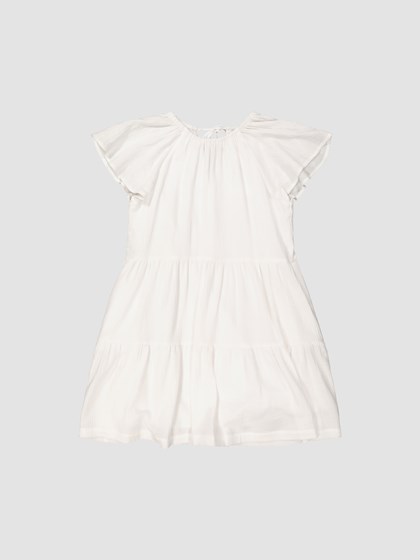 Feminin sommerkjole i krinklet myk bomull med kort flaggermuserm, gode lommer i siden, rund hals med splitt og snøring i nakken, søm i livet og utskrådd kappeskjørt med god vidde. Modellen er 176 cm høy og bruker str M.