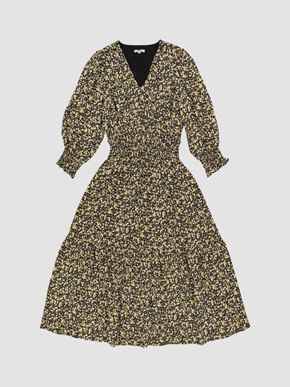 Feminin kjole i småmønstret lett viskose kvalitet med v utringing, 3/4 lang pufferm med elastikk og rysjekant nederst, bred elastikk i livet og utskrådd kjsørt med høy kappe. Kjolen er foret og har god lengde. Modellen er 170 cm høy og bruker str S.