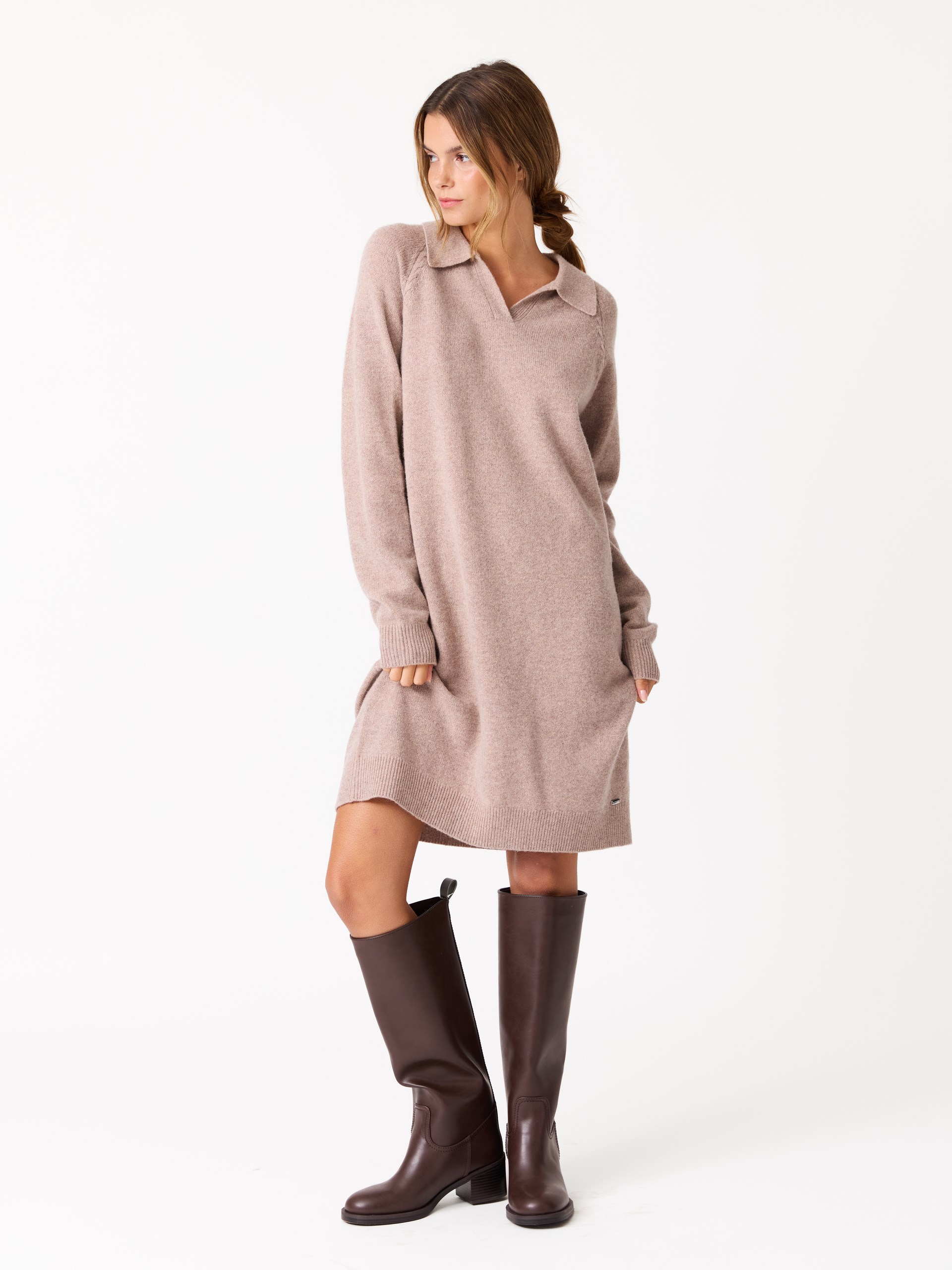 Glattstrikket kjole ull med krage og v utringing