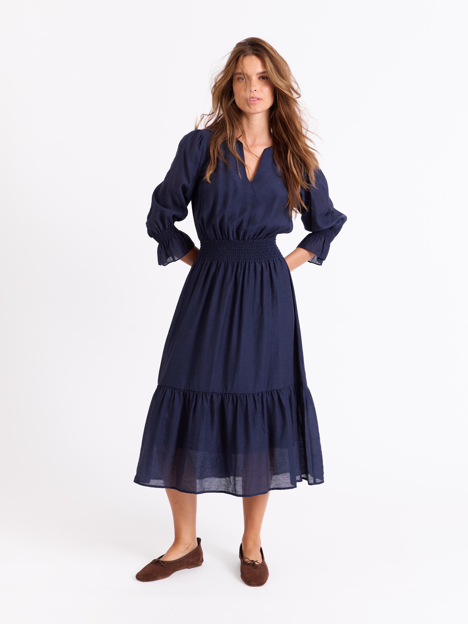 Kjole i lett strukturert viskoseblanding med v hals og fôr i kroppen.