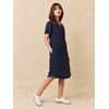 Klassisk kjole i en fin blanding av bomull og lin med praktiske stikklommer i siden. Kjolen har rund hals med v-formet frontåpning, kort erm med oppbrett, og buet avslutning nede. Liten sølvfarget metallbadge nederst på venstre side. Rygglengde 102 cm i str M