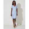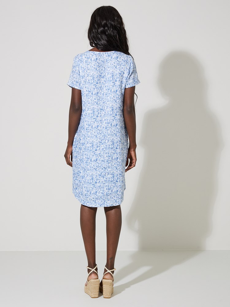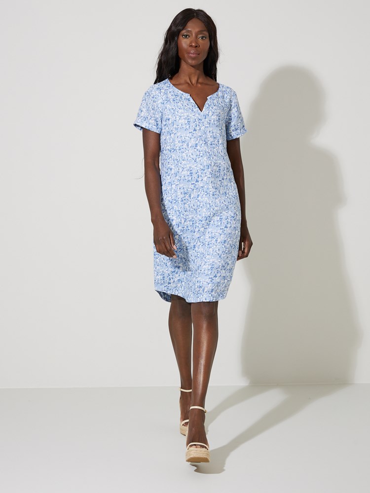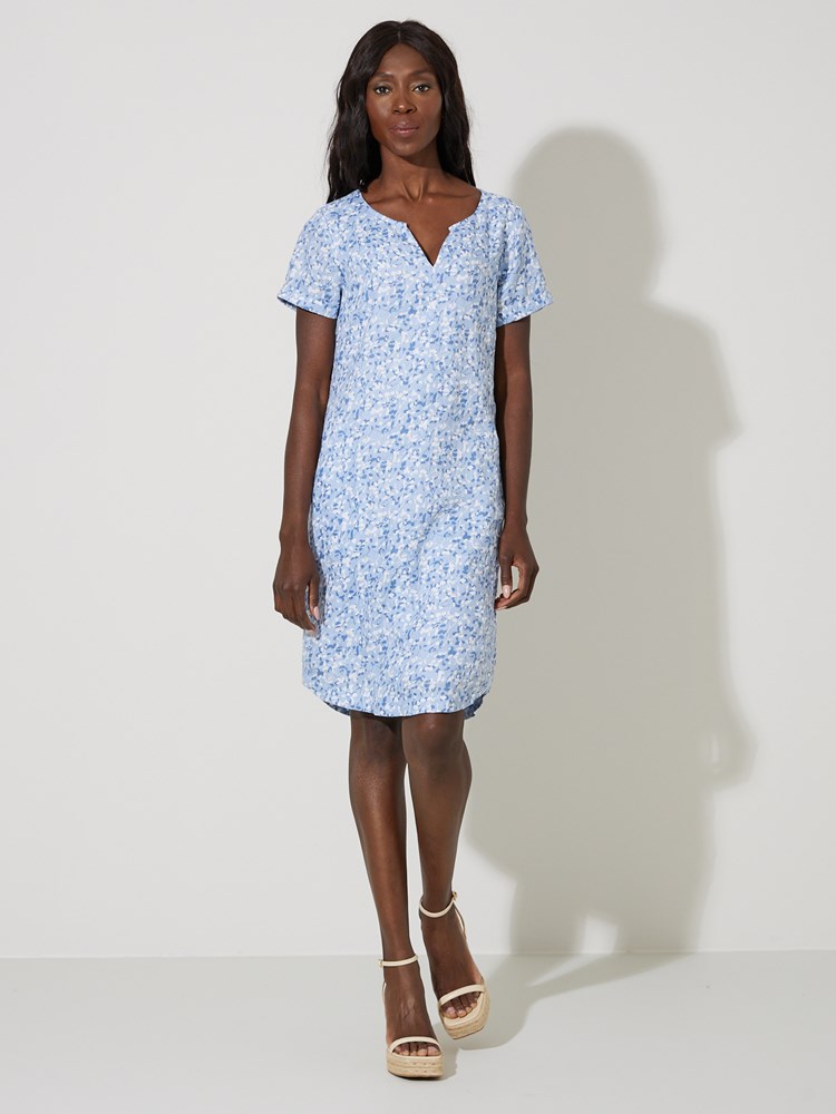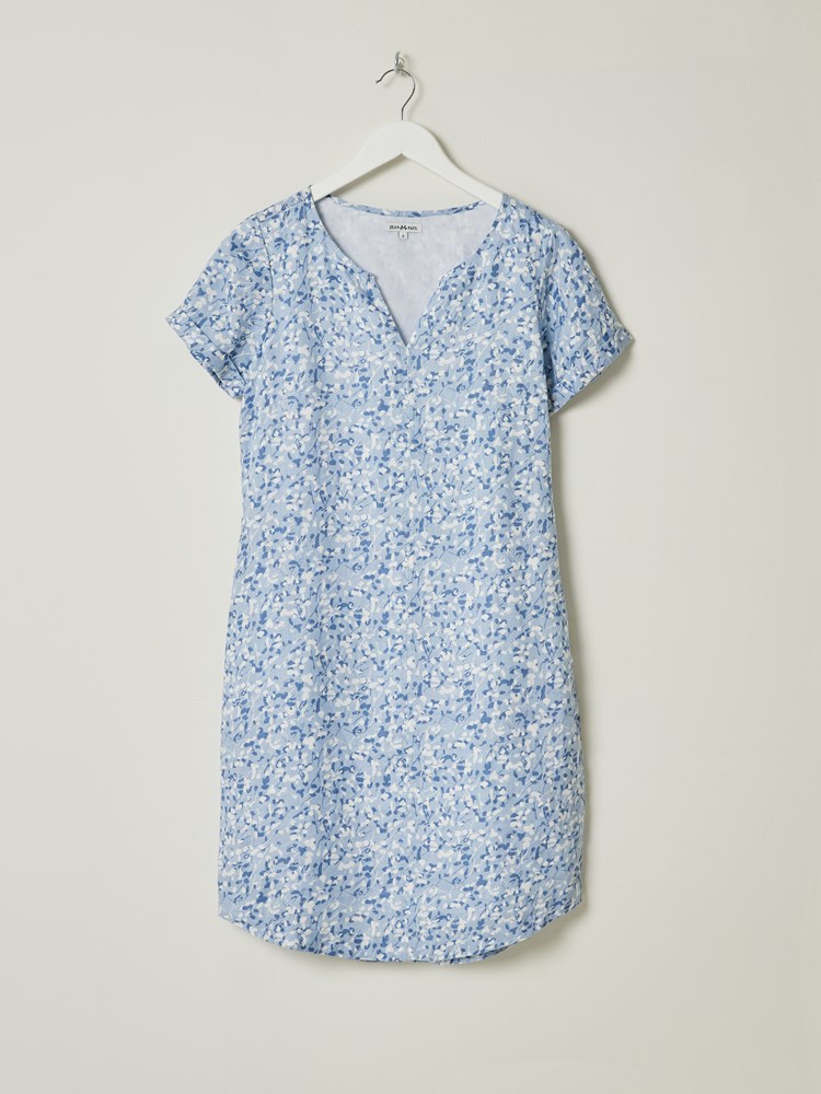 Klassisk småmønstret kjole i en fin blanding av bomull og lin med praktiske stikklommer i siden. Kjolen har rund hals med v-formet utringing, kort erm med oppbrett, og rundet avslutning i sidene. Liten logobadge i sølvfarget metall nederst på venstre side. Modellen er 177 cm høy og har på seg str S.