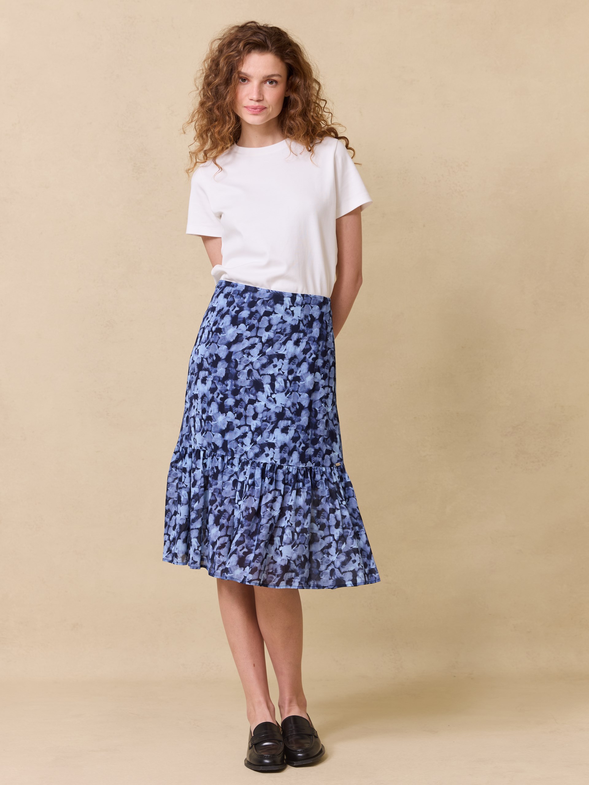 Legglangt skjørt i lett mønstret viskose med innvendig fôr. Skjørtet har enkel linning, glidelås i siden , ettersittende hofteparti og høy kappe nederst. Liten logobadge nede på siden.