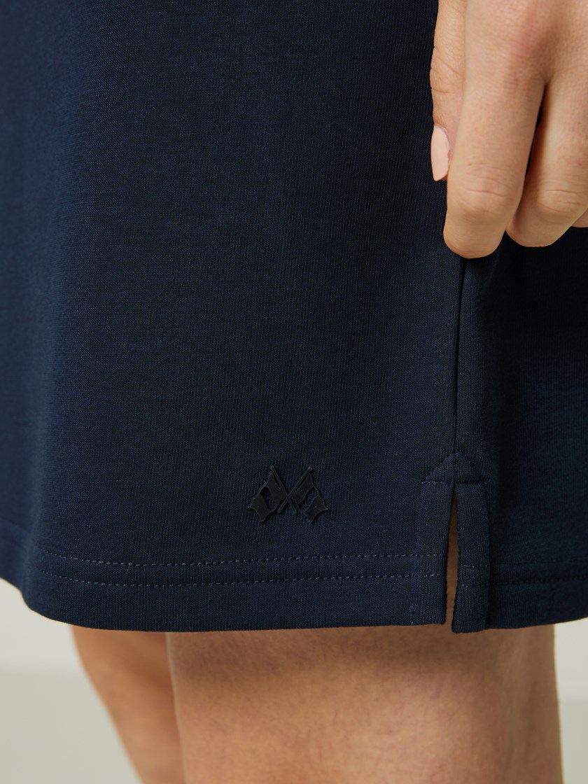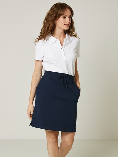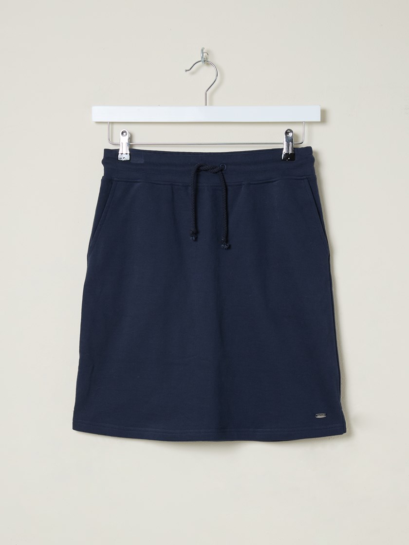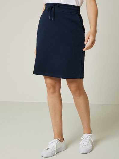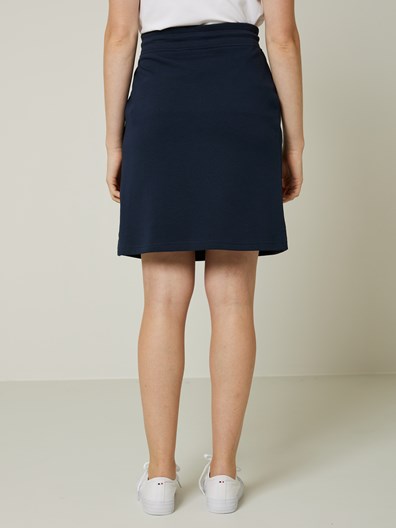Behagelig skjørt i bomull med snøring i livet. Skjørtet har to skrå lommer i front, buet avslutning med små splitter nederst. Liten logobagde i gummi nede på siden.