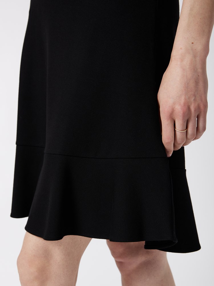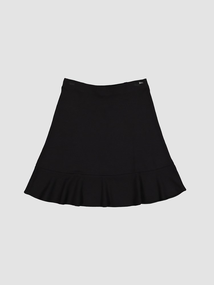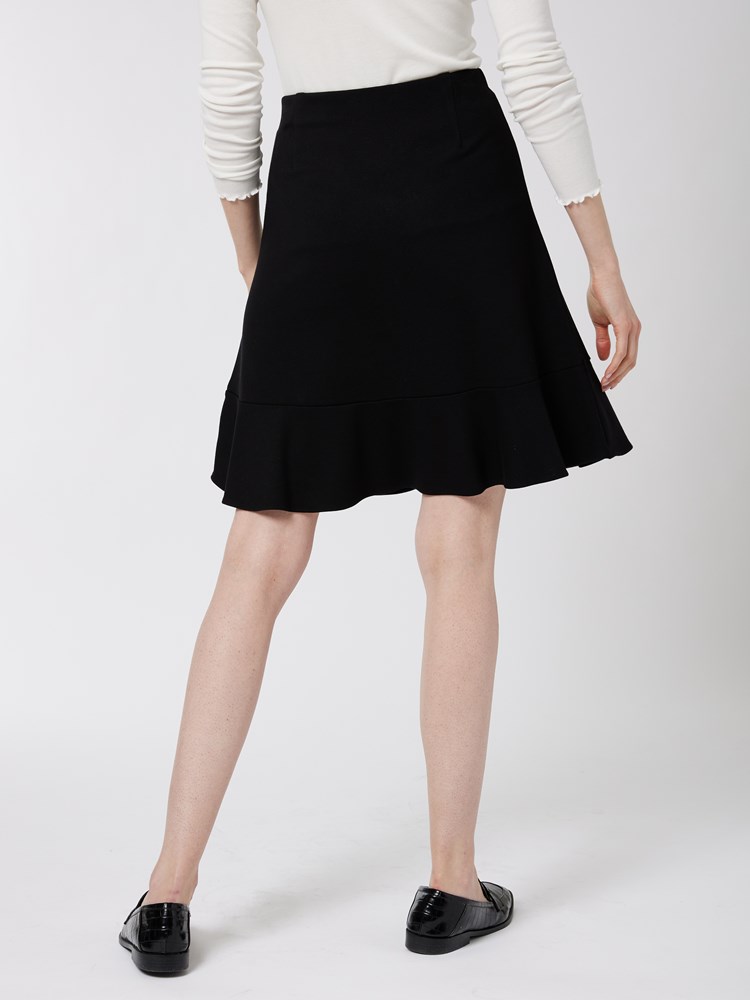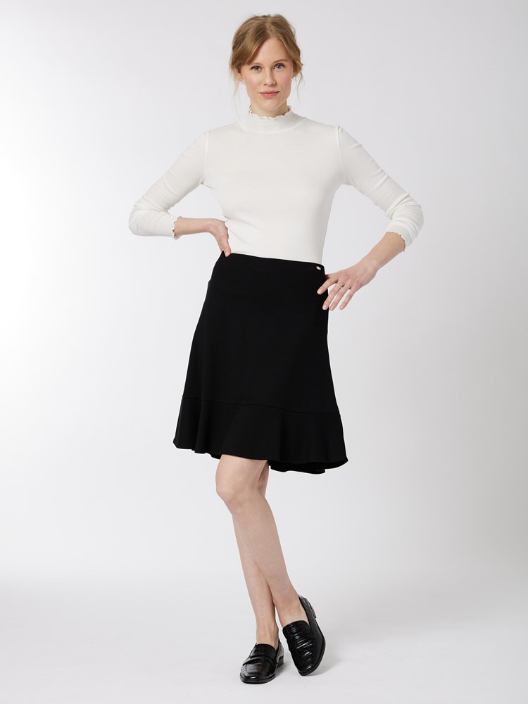 Jerseyskjørt i behagelig viskoseblanding med god stretch. Skjørtet har elastikk i livet, utskrådd fasong og en bred kappe nederst.