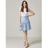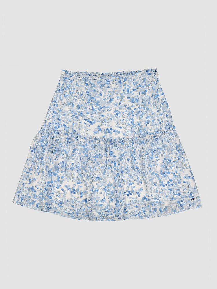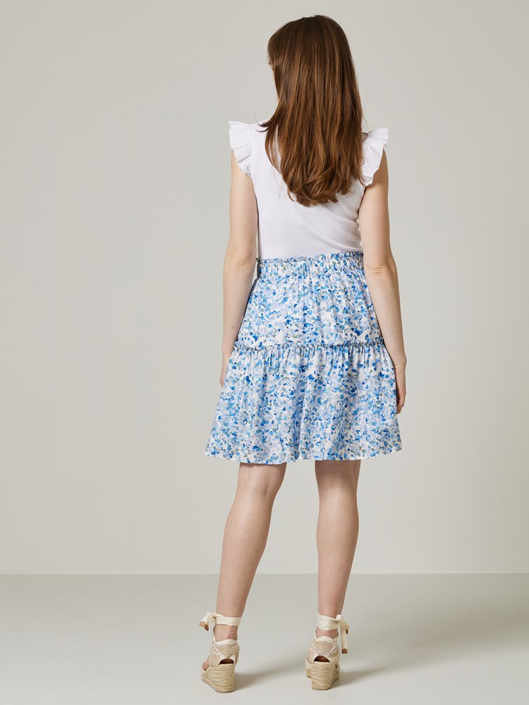 Delikat blomstret kappeskjørt i viskose med glidelås i siden og elastisk linning bak. Skjørtet har innvendig fôr, glatt hofteparti og kappe med en liten rysjekant. En liten logobadge i metall nede på siden. Lengde ca til kneet.
