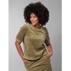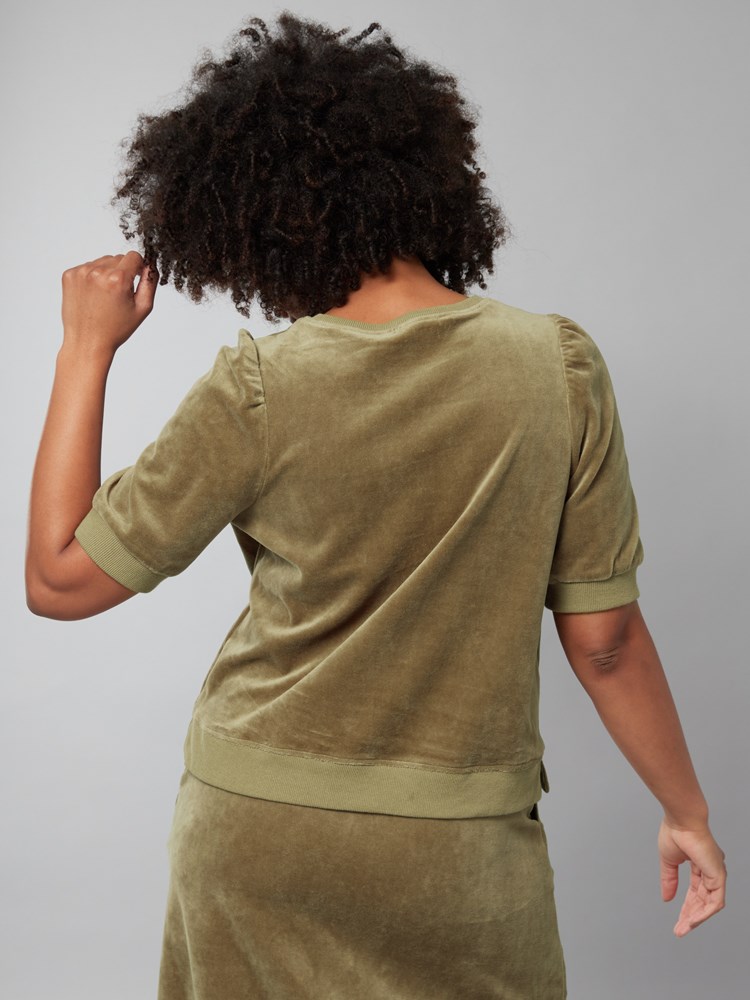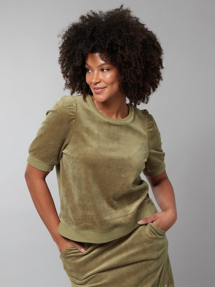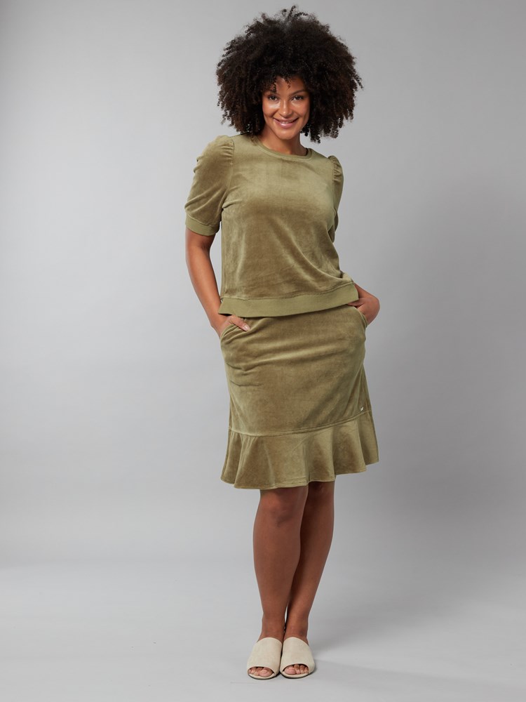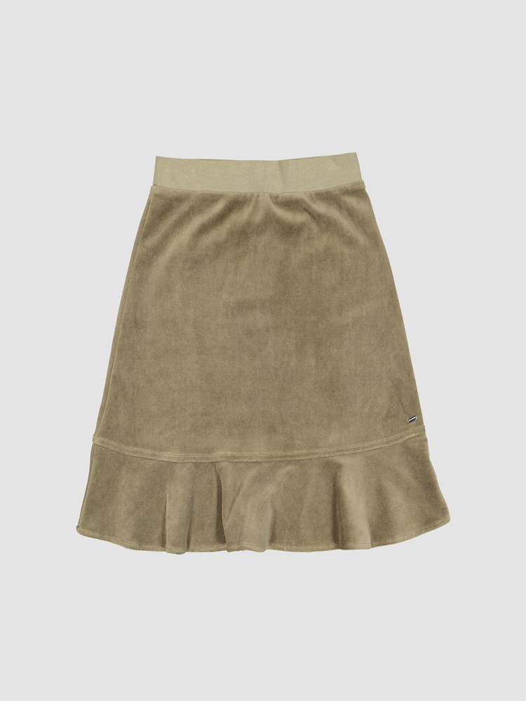 Velourskjørt i myk kvalitet med stikklommer, elastisk rib i livet og volangkant nederst. Skjørtet har en utskrådd fasong og en liten metallbadge i sølvfarget metall nede på siden. NB! Skjørtet har ikke lommer som på modellbildet.