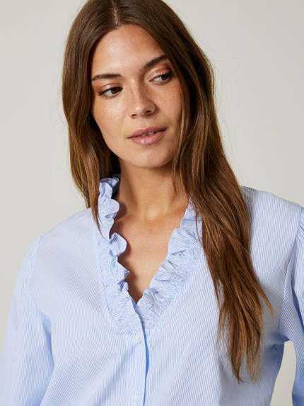 Smalstripet feminin bluse i bomullspoplin med v ringet rysjekrage og ton i ton knapper. Blusen har lang erm med liten puff og knappet mansjett, rett passform og en liten metallbadge med logo nede på siden. Modellen er 173 cm høy og bruker str S.