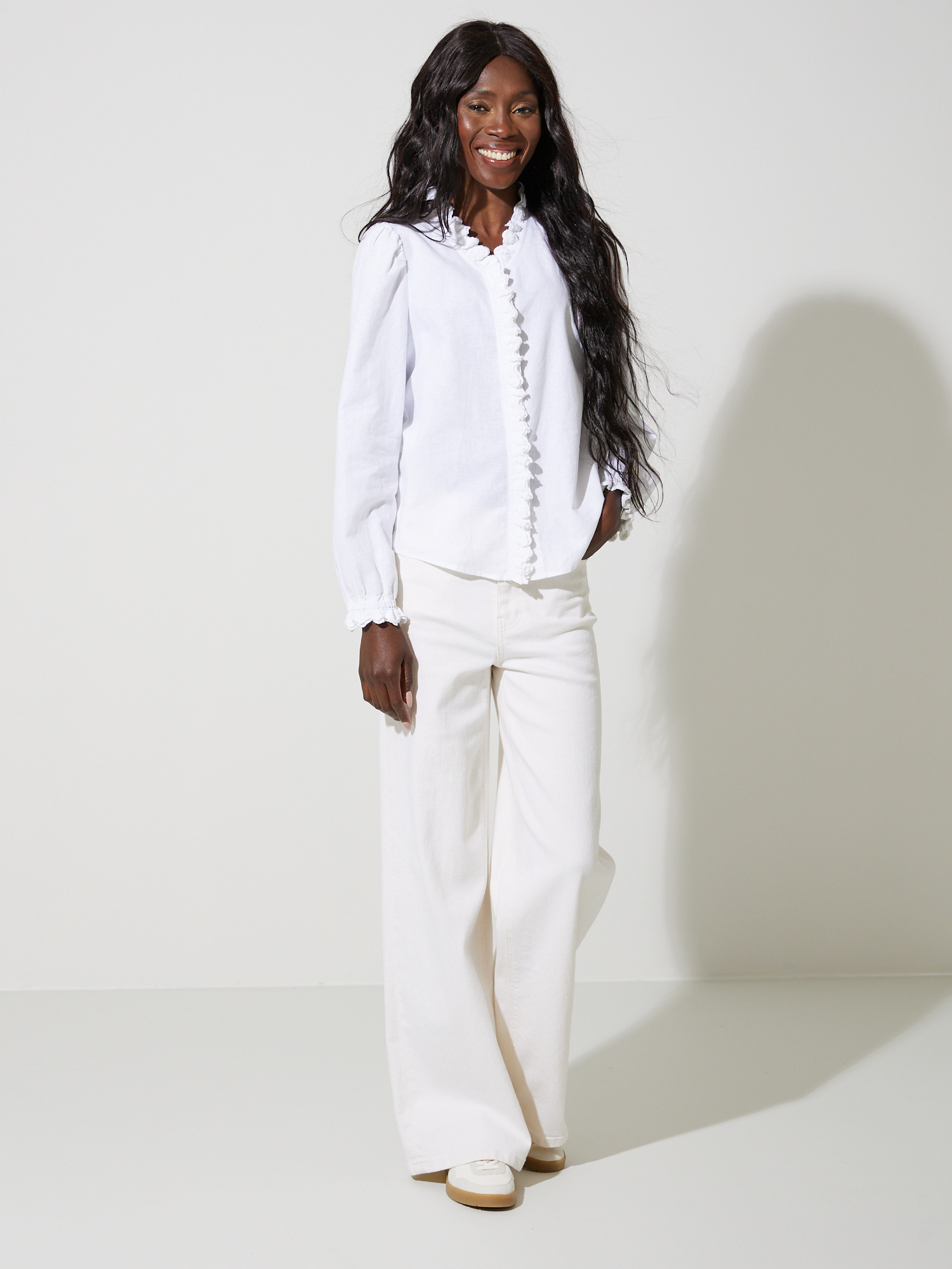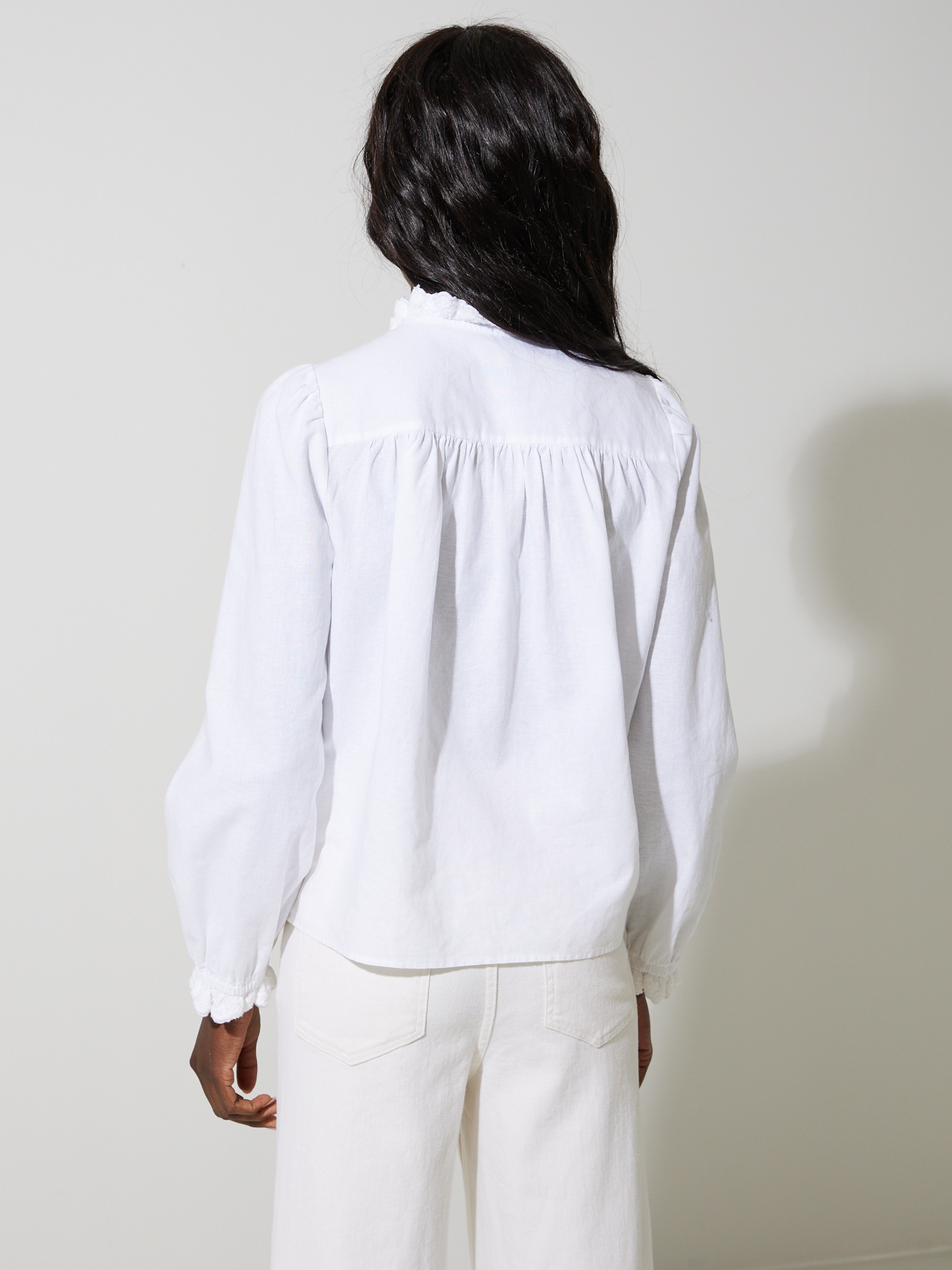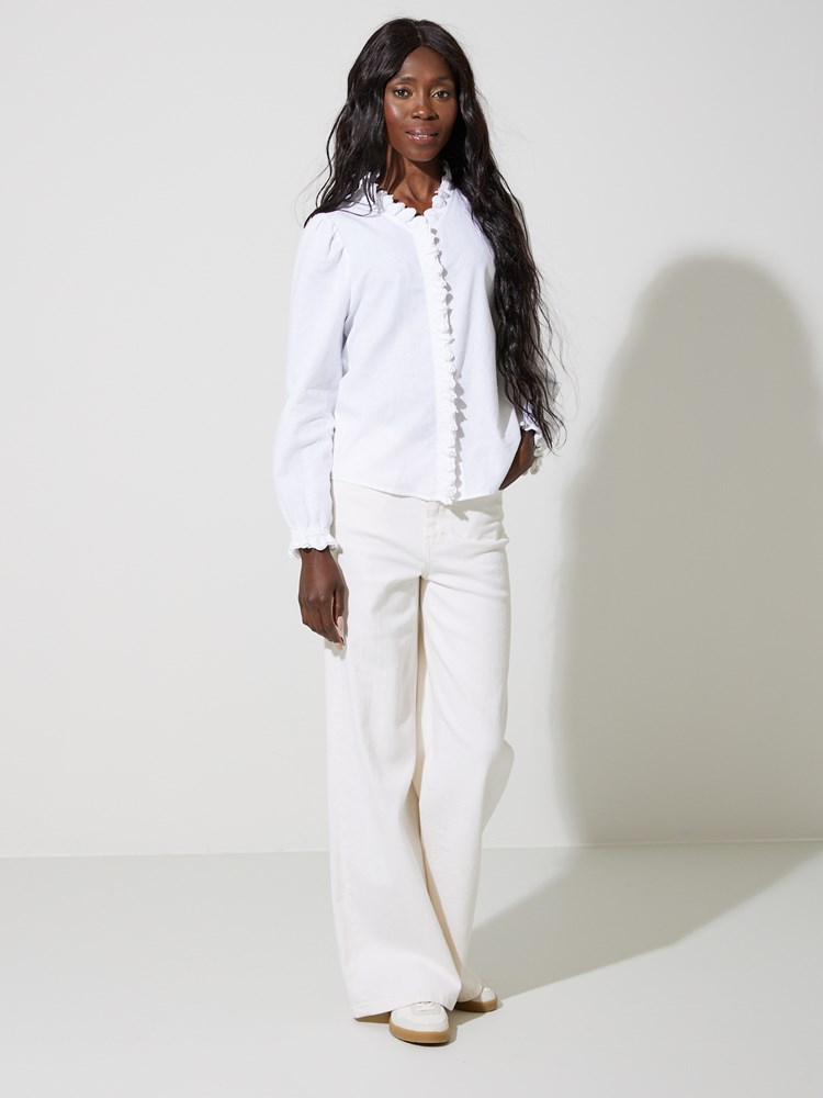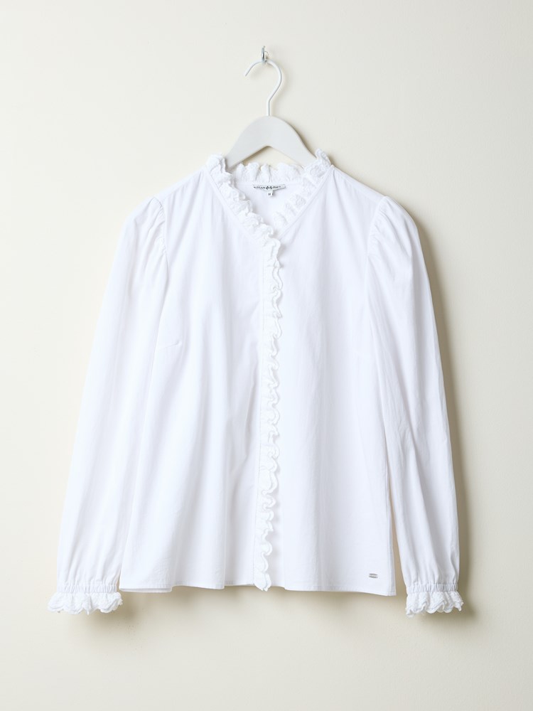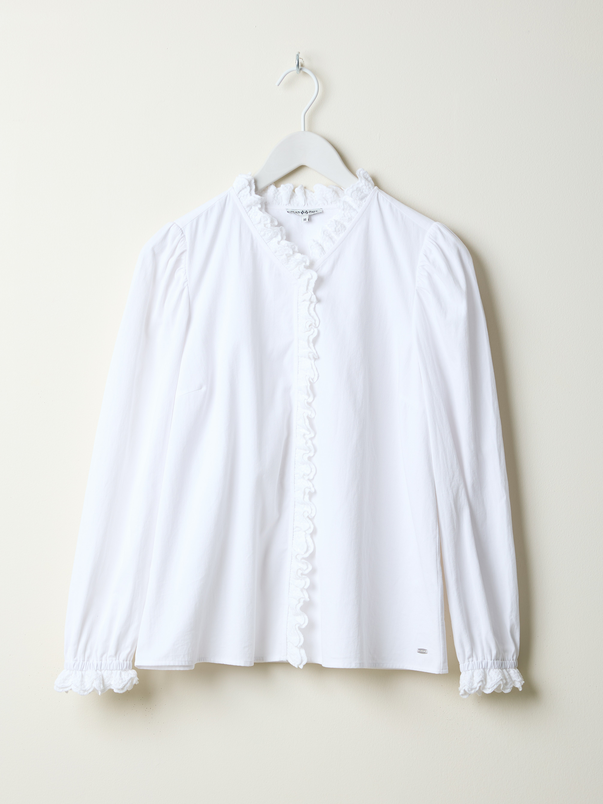 Bluse i bomull med rysjekant av blonde i halsen og langs stolpen i front. Skjult knepping. Blusen har lang pufferm med elastisk mansjett og rysje av blonde på ermet. Bærestykke med rynker bak og en liten metallbadge nede på siden. Ledig passform. Modellen er 177 cm høy og bruker str S.