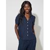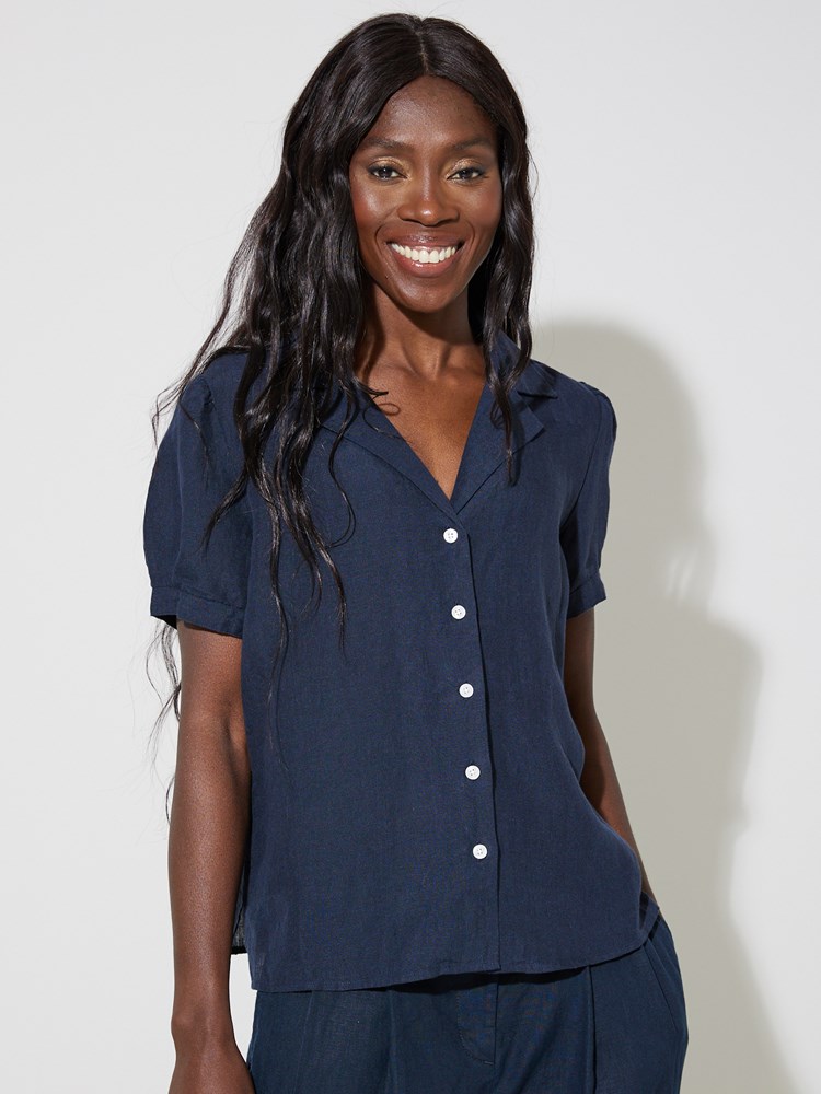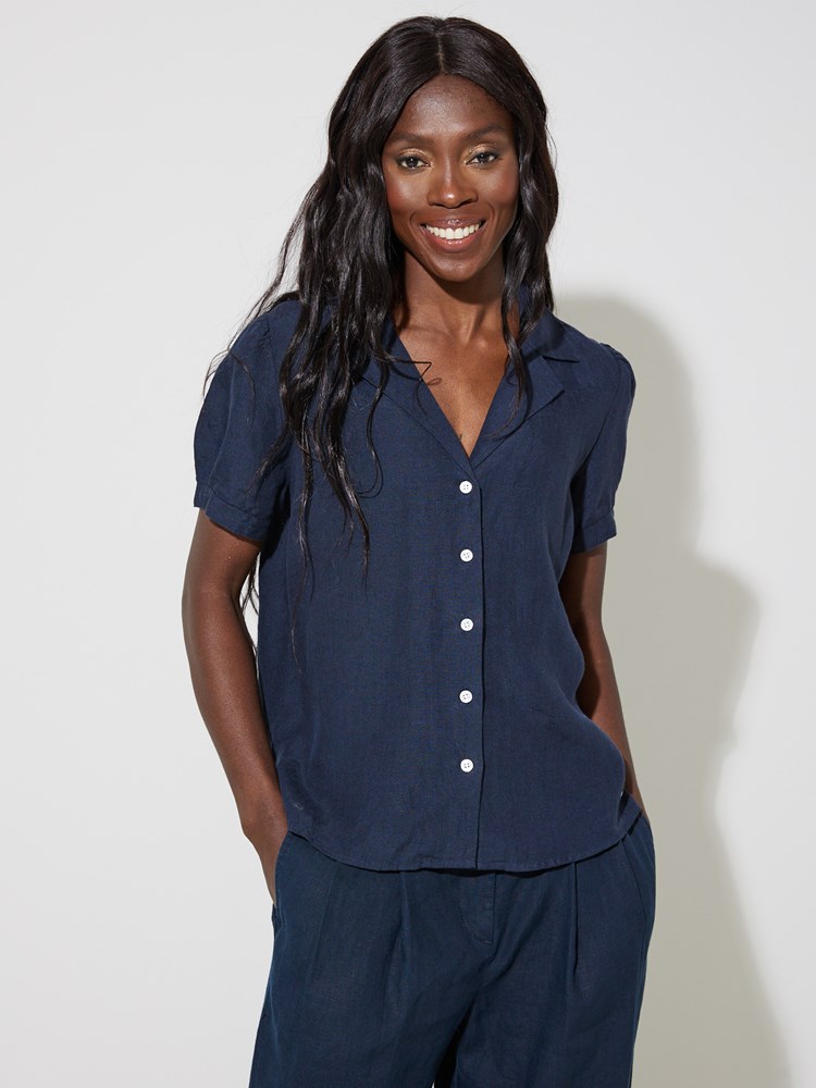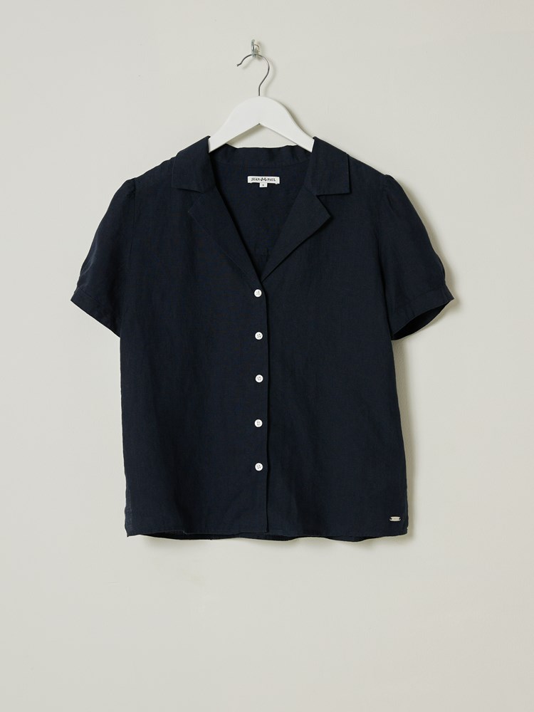 Kort og nett linskjorte med kort erm, v utrininging, lyse knapper og splitter i siden. Skjorten har bærestykke bak og en liten sølvfarget logobadge nede på siden. Modellen er 177 cm høy og bruker str S.