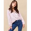 Mønstret bluse av delikat viskosesateng i en blanding av 70% viskose og 30% LENZING™ viskose. Blusen har vide 3/4 lange raglanermer med sømdetaljer og elastisk mansjett, halsåpning med små rynker, v hals og knytesnor, og ledig passform. Liten logobadge i metall nede på siden