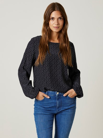 Småmønstret bluse i behagelig viskose med rundet halsåpning og rett passform med splitter i sidene og lett buet avslutning bak. Blusen har lang erm med myk elastikk og rysjekant. Liten logbadge i metall nede på siden. Modellen er 173 cm høy og bruker str S.