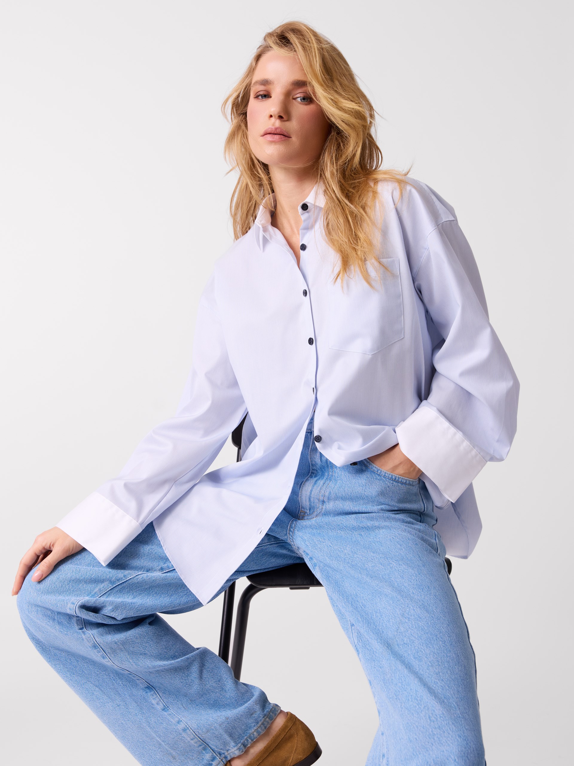 Modellen er 170 cm høy og har på seg str S.Lulu skjorte