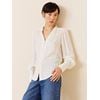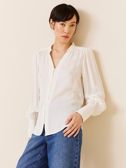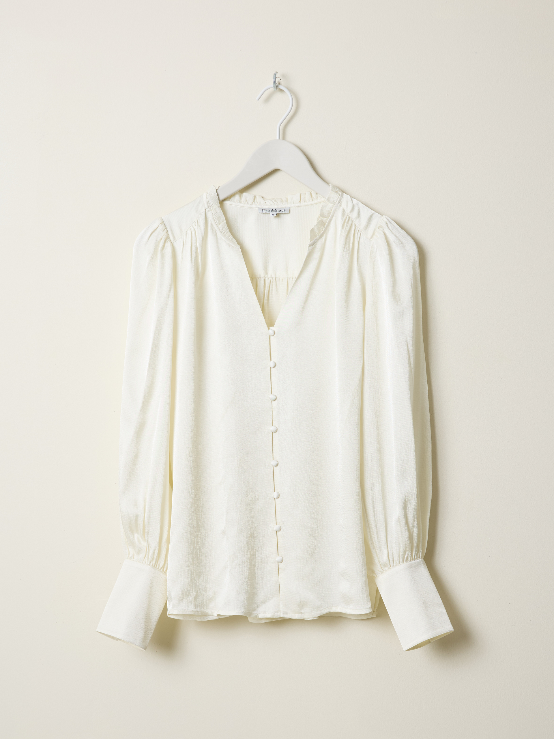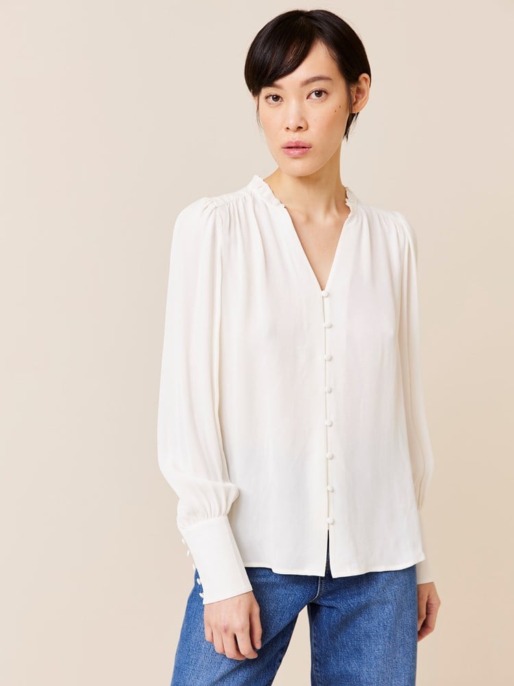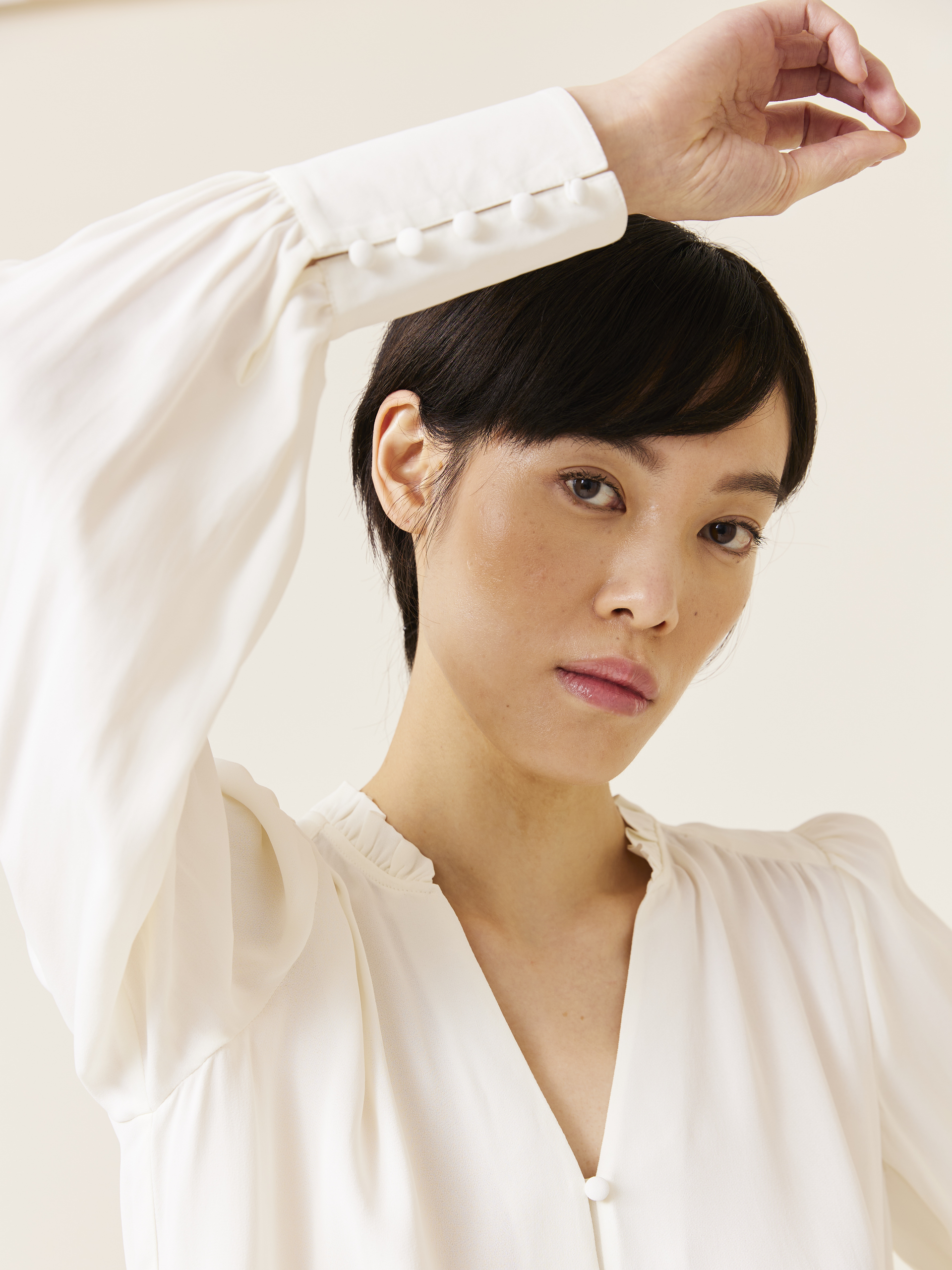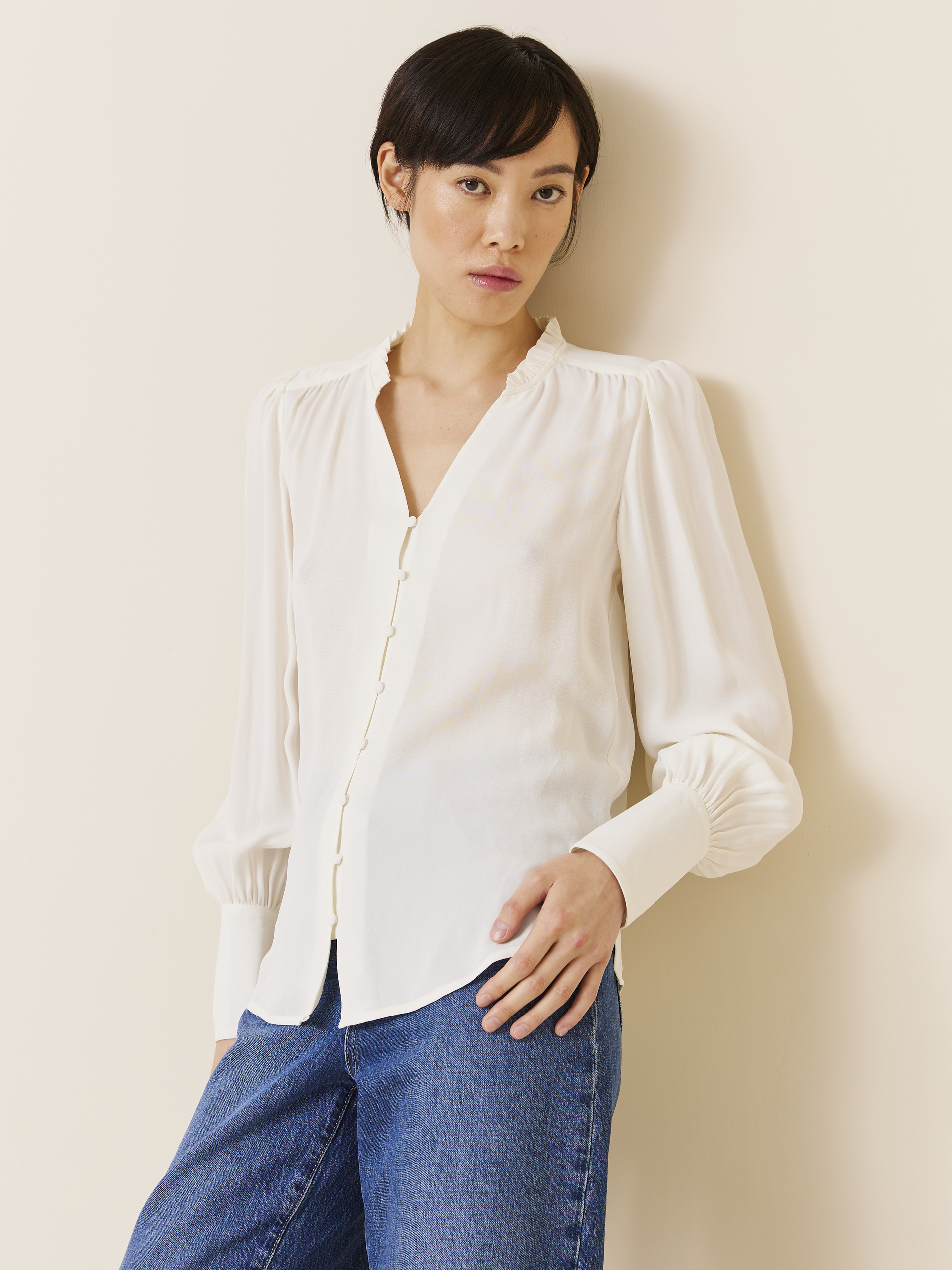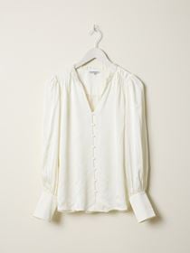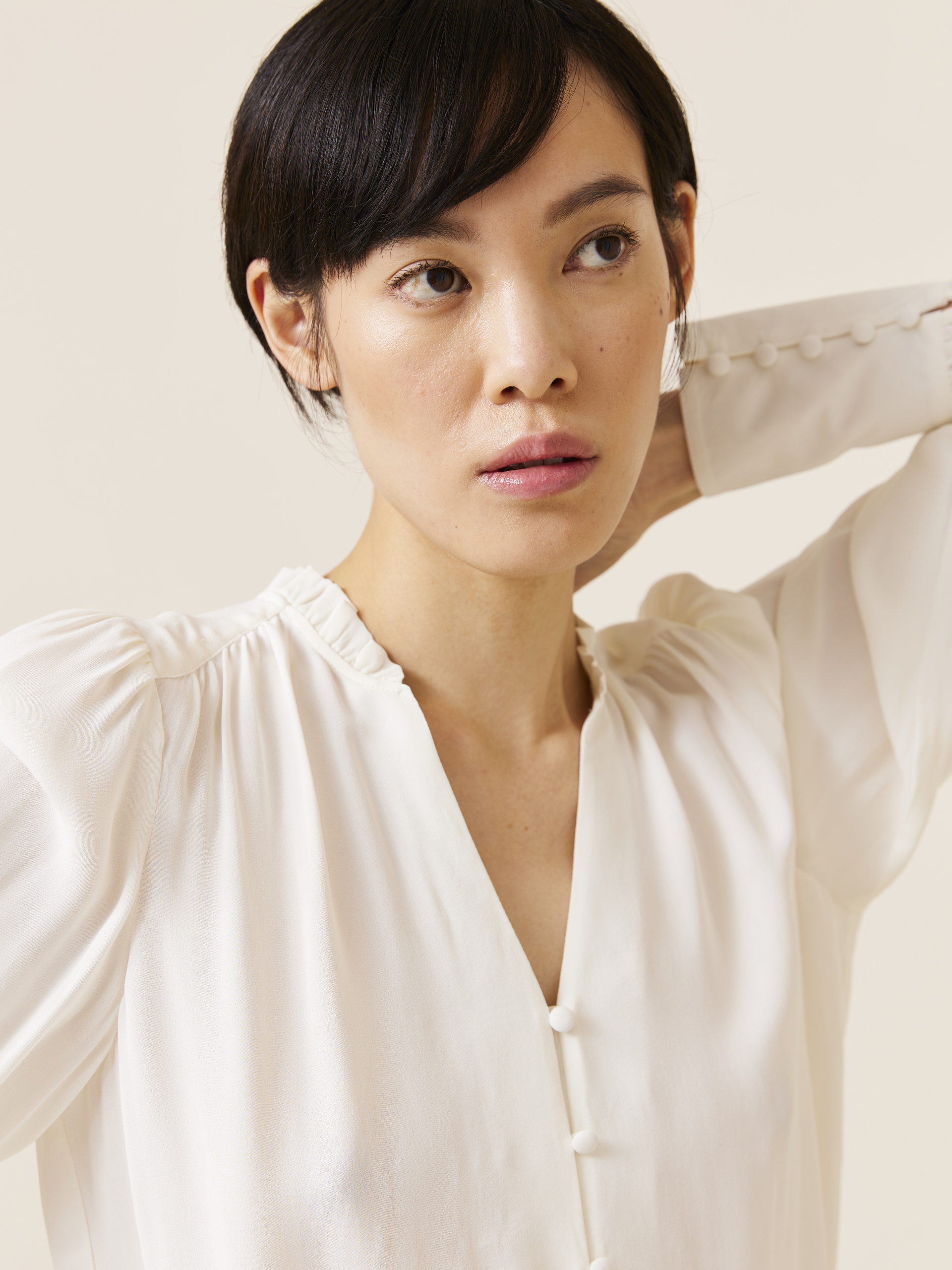 Delikat bluse i lett viskose med ledig passform, splitter i sidene og bærestykke med små rynker bak. Blusen har en liten rysjekrage, v utringing, knapping i front og lang pufferm med høy knappet mansjett og stofftrukne knapper. Modellen er 170 cm høy og bruker str S.