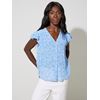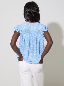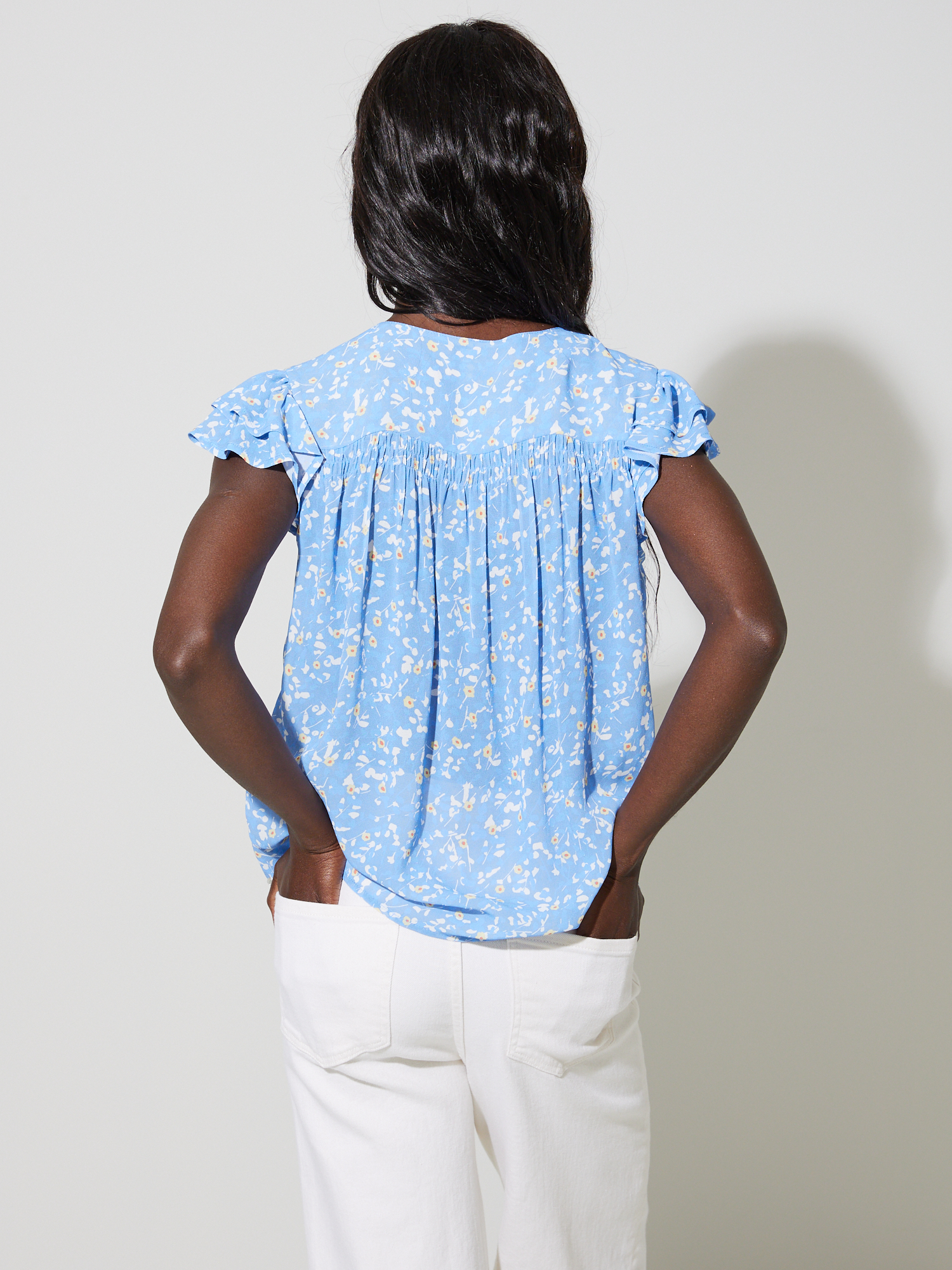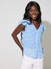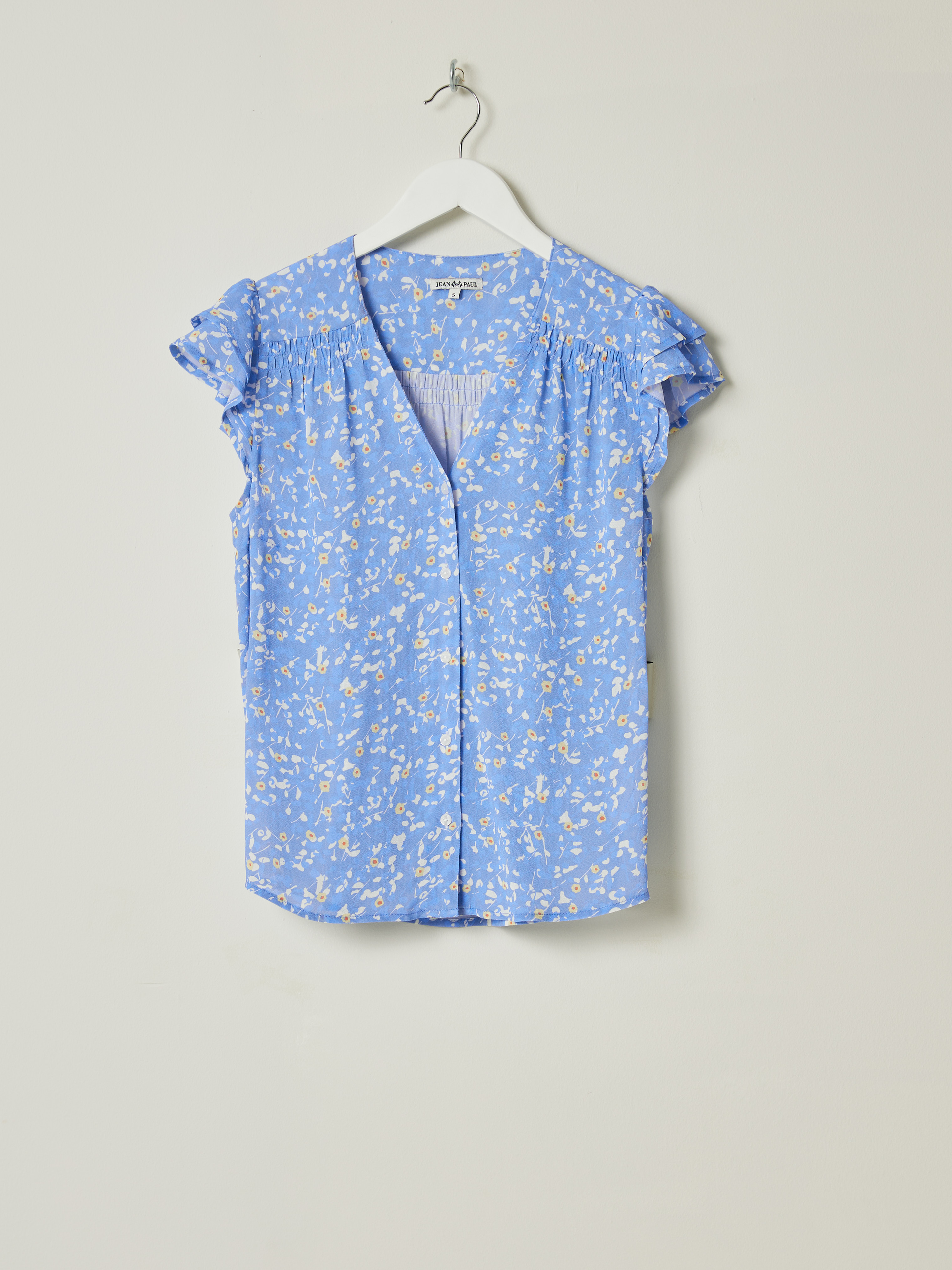 Feminin småblomstret viskosebluse med kort volangerm og v utringing. Blusen har lyse knapper i front og fine rynkesømmer på skulder og bærestykket bak. Ledig passform. Modellen er 177 cm høy og har på seg str S.