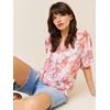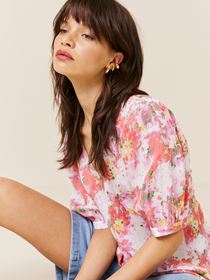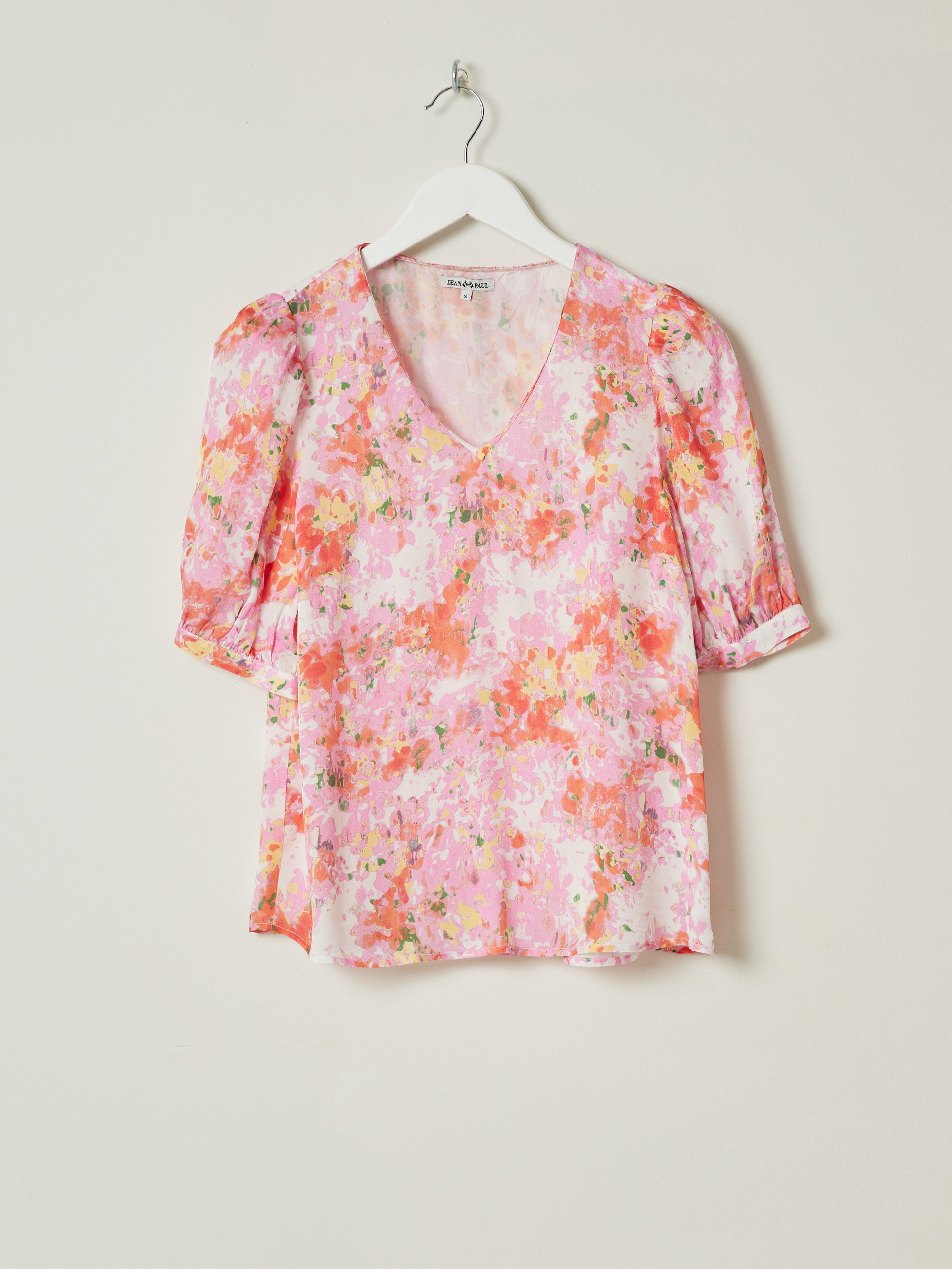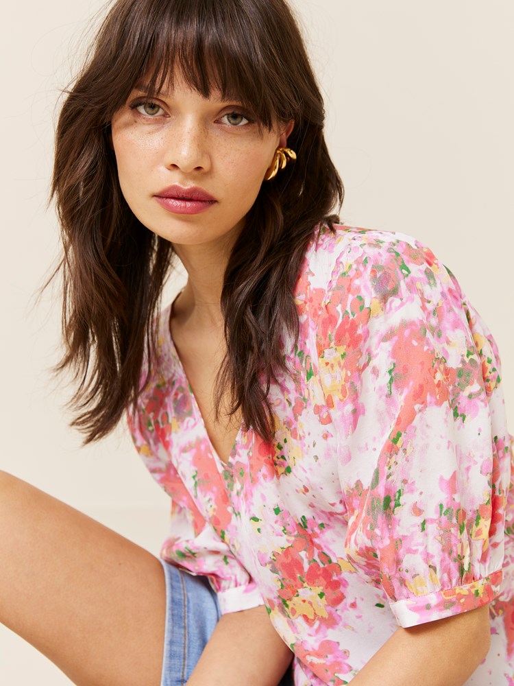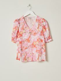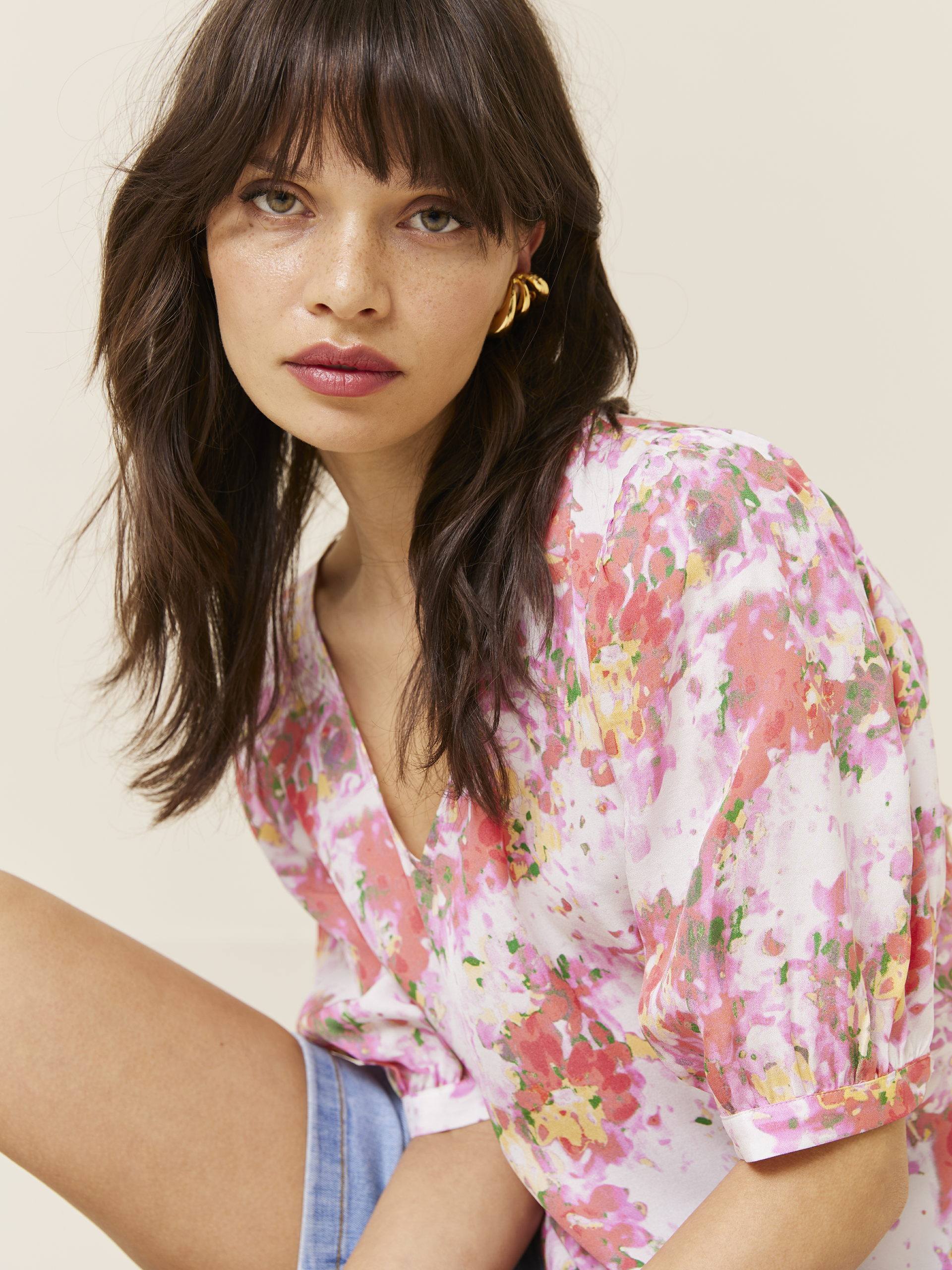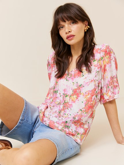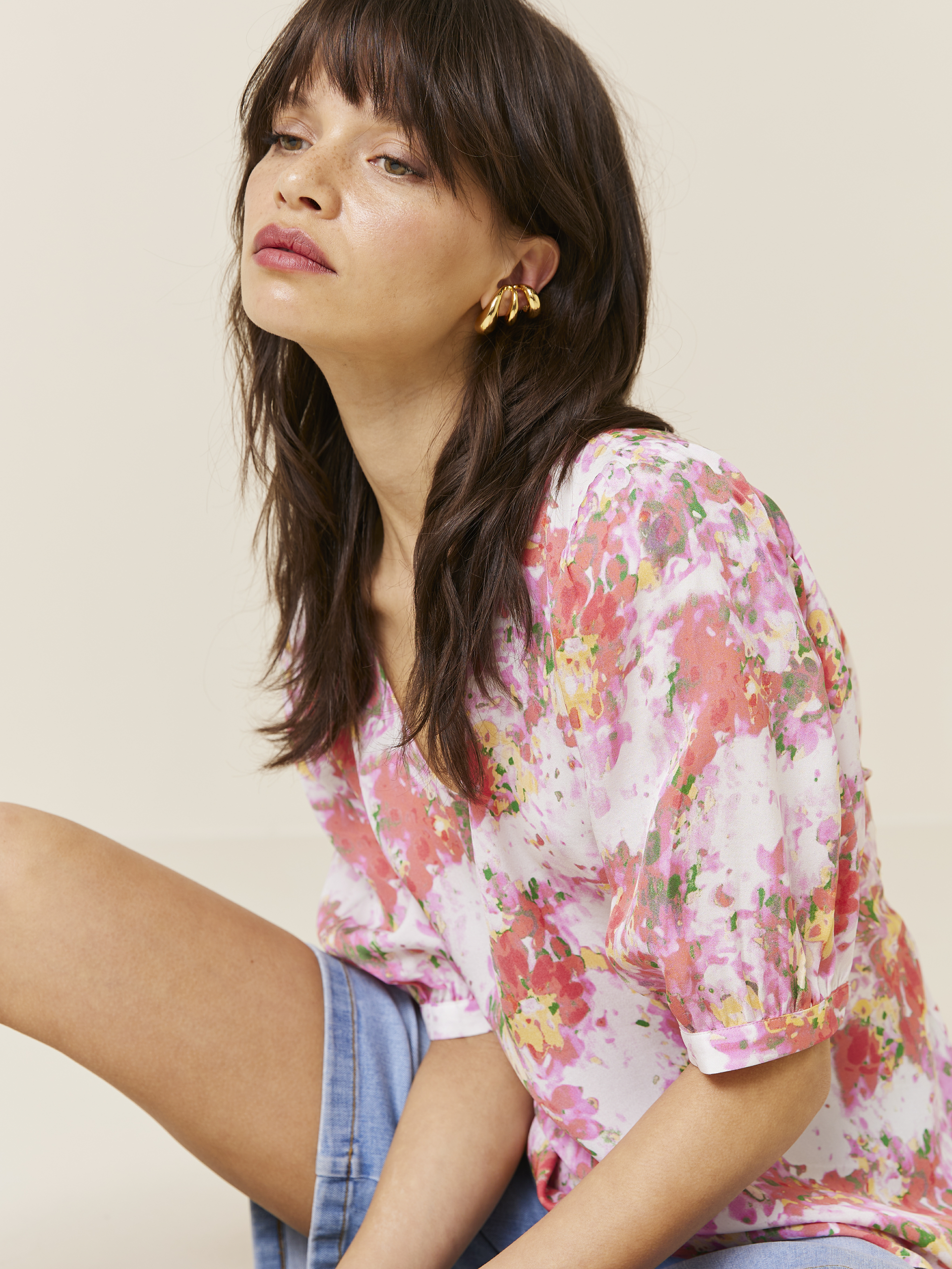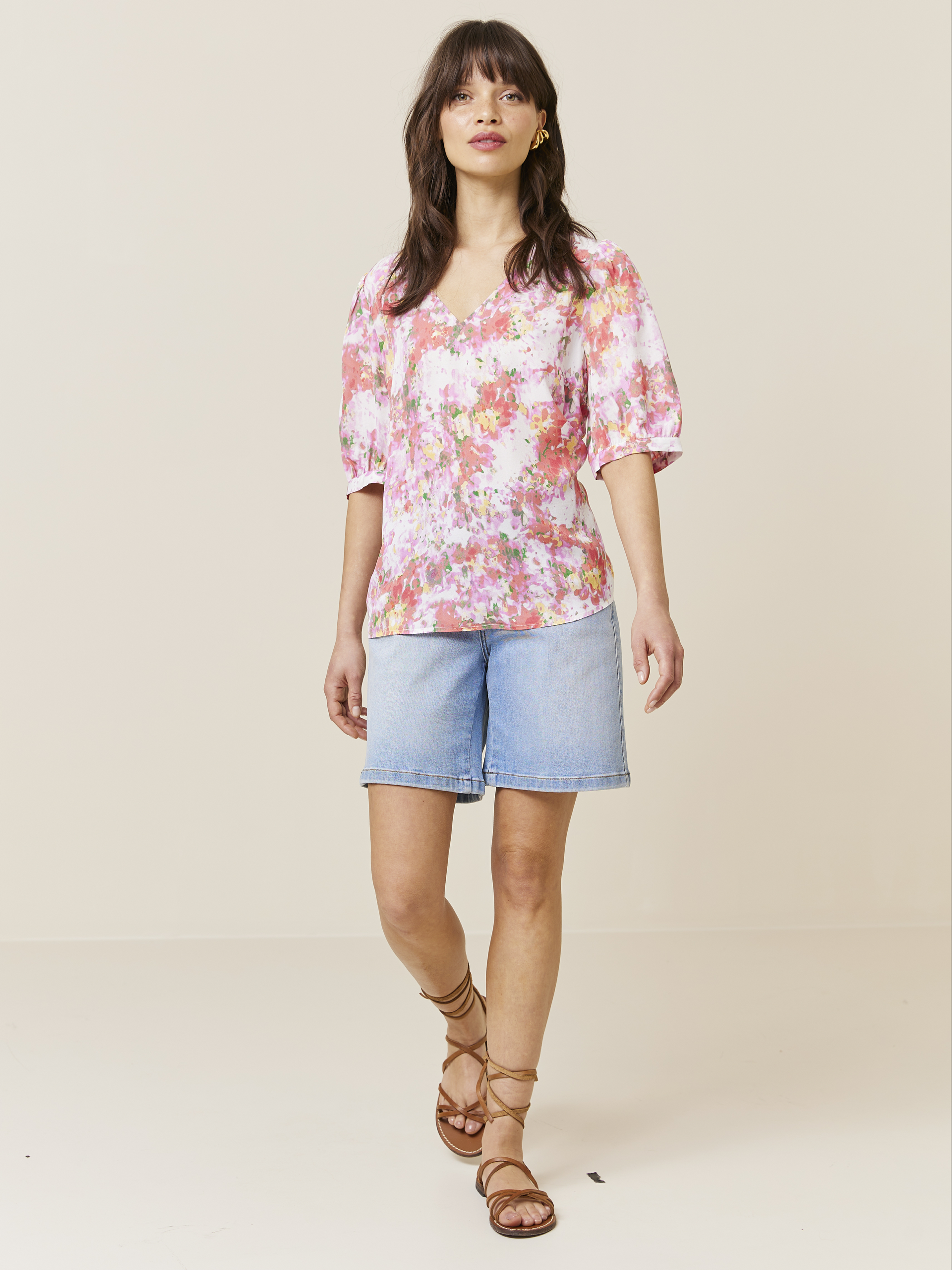 Feminin bluse med kort pufferm og smal knappet mansjett på ermet. Blusen er i lett mønstret viskose, har v utringing og ledig passform.