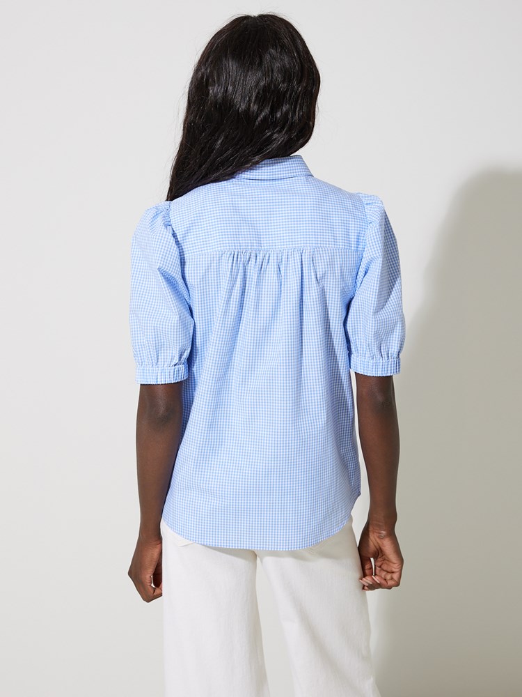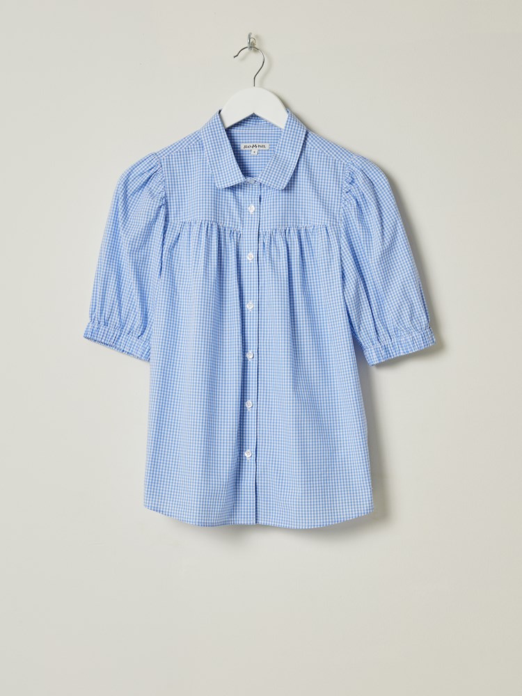 Feminin smårutet bluse i lett bomull med avrundet krage og kort pufferm med elastikk nederst. Blusen har bærestykke med rynker foran og bak, rett passform med buet avslutning nederst og en liten metallbadge med logo nede på siden. Modellen er 177 cm høy og har på seg str S.