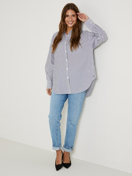 Stripet skjorte i krisp bomullspoplin med oversized passform og bærestykke med motfold bak. Skjorten har ton i ton knapper i front, brystlomme og buet avslutning nederst. Modellen er 173 cm høy og bruker str S.