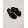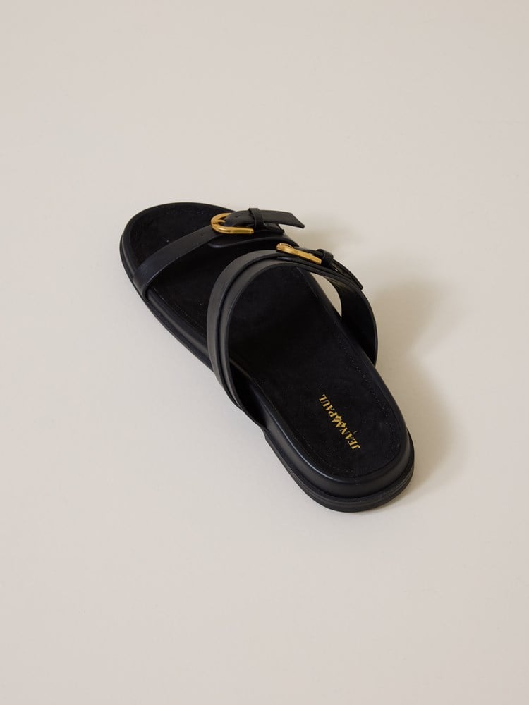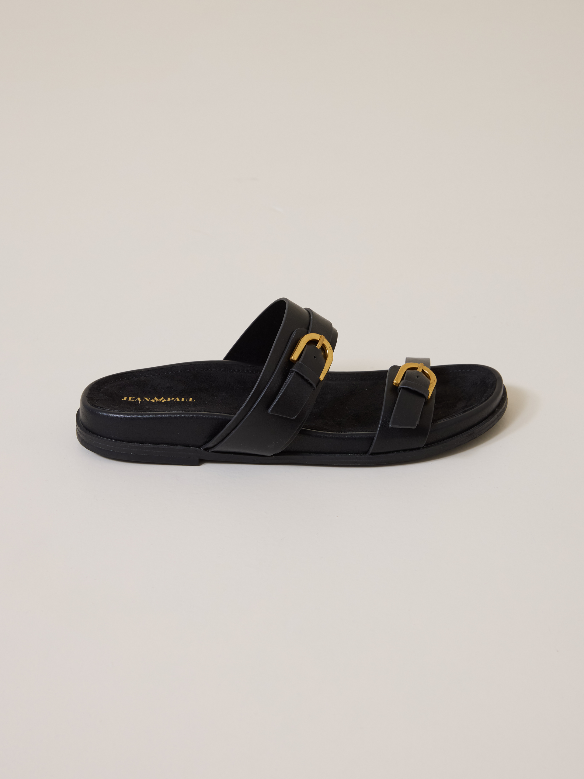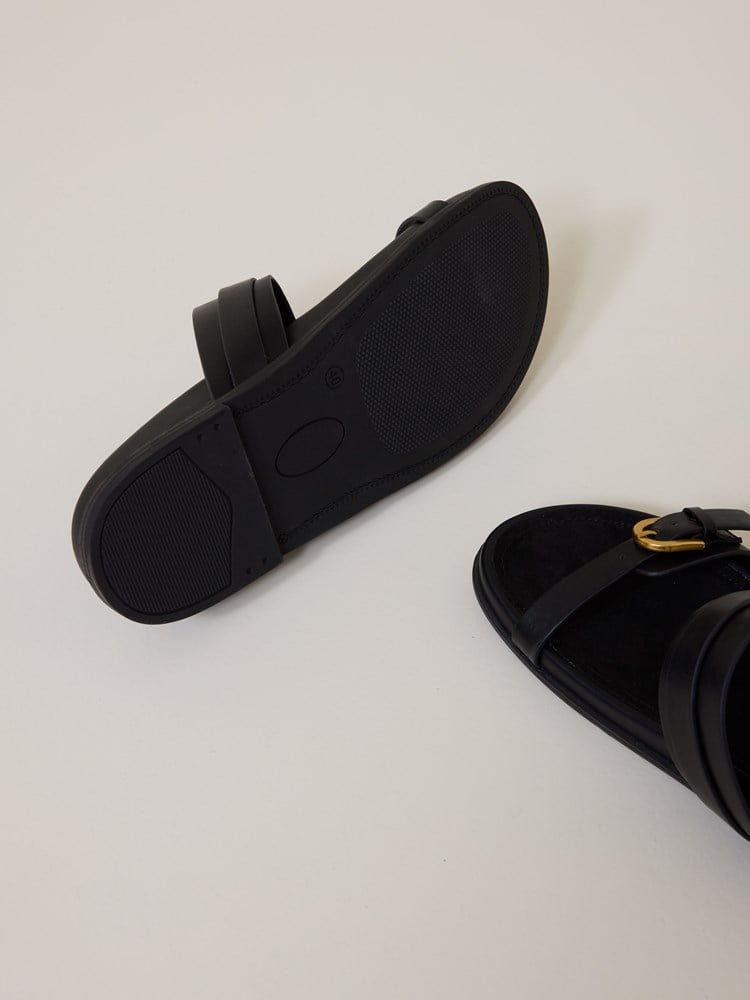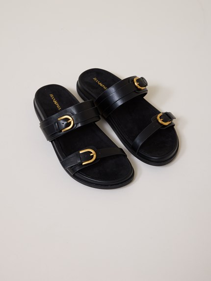 Flat, behagelig og sommerlig sandal i kunstskinn med ergonomisk fotseng og to justerbare remmer med gullfargede metallspenner.
