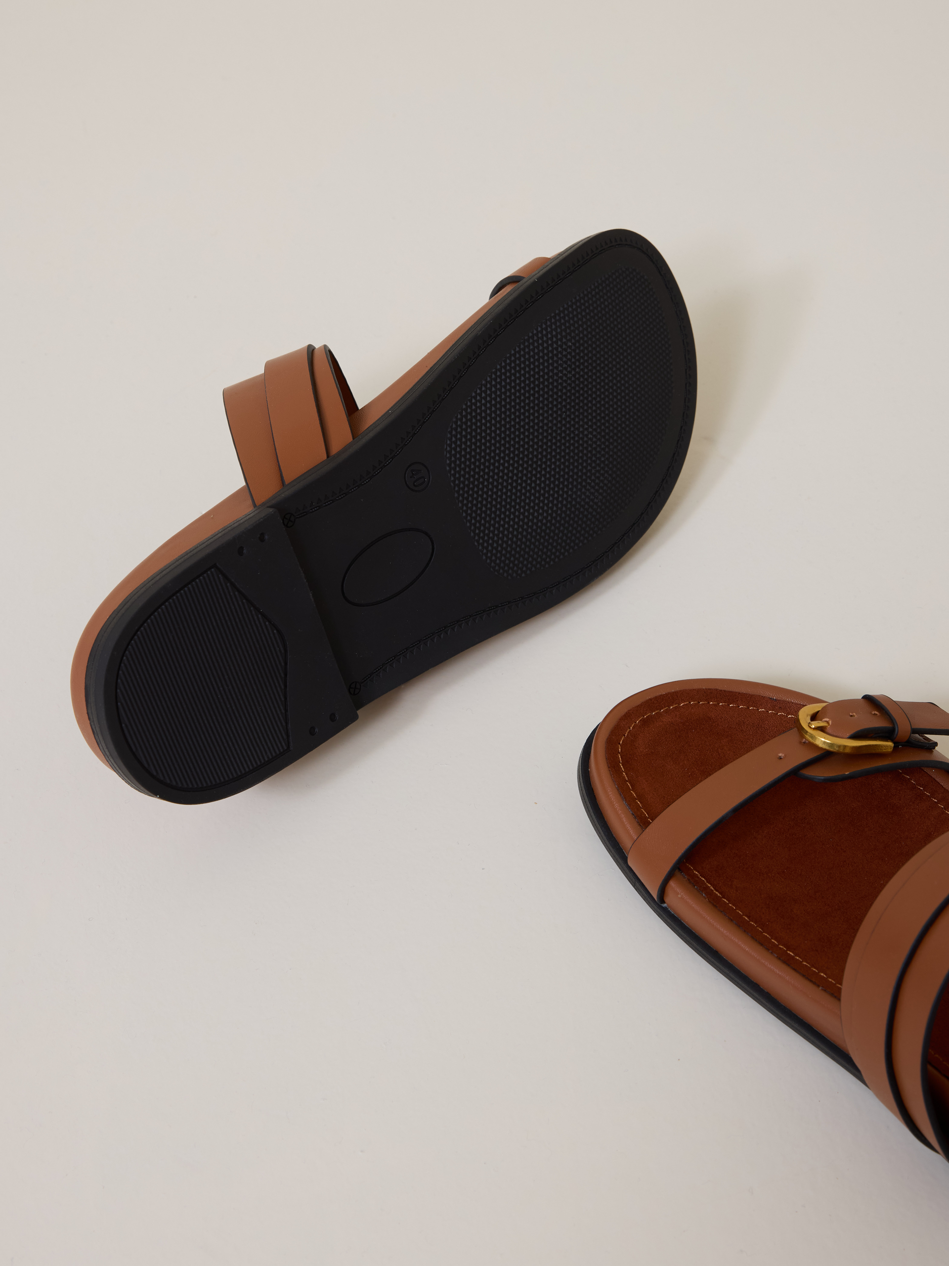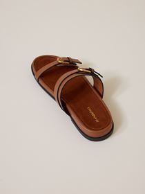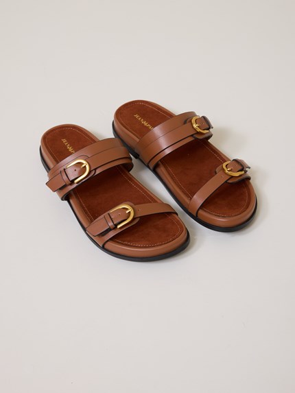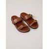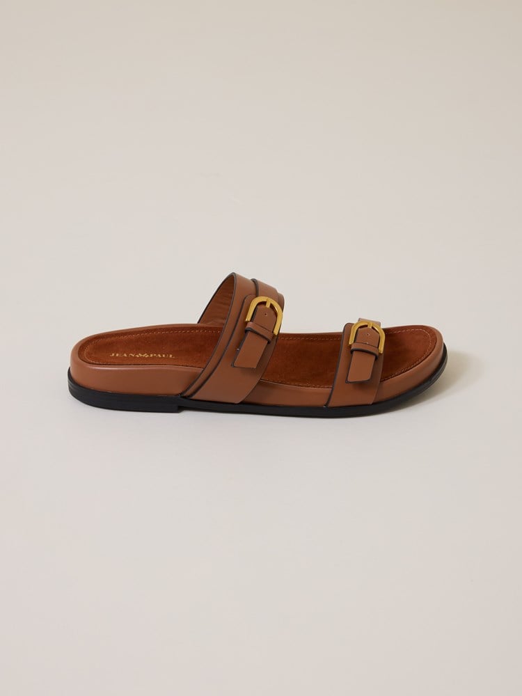 Flat, behagelig og sommerlig sandal i kunstskinn med ergonomisk fotseng og to justerbare remmer med gullfargede metallspenner.