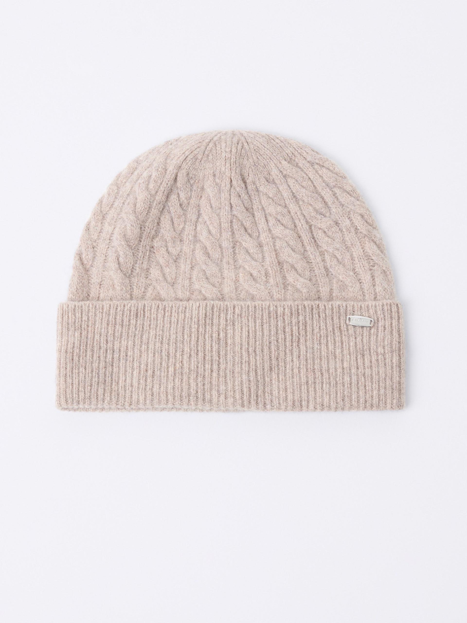 Kabelstrikket lue i 100% ull. Luen har oppbrett og en liten logobadge i metall