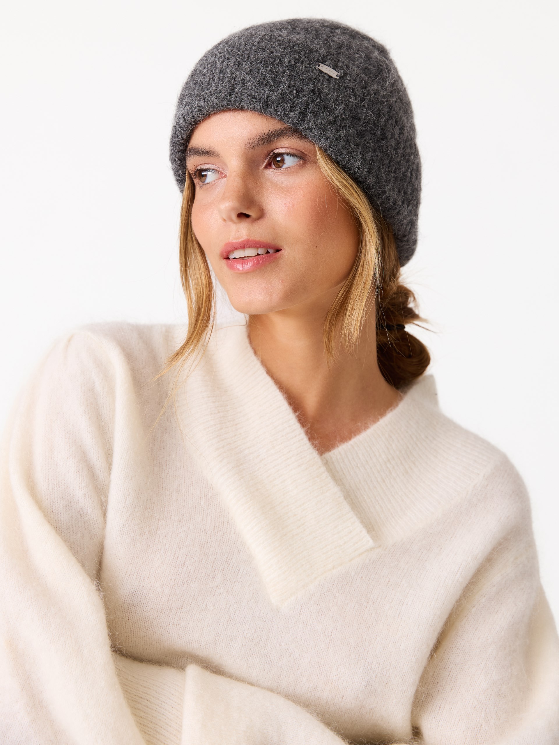 Ribbestrikket myk lue i ullblanding. Luen har oppbrett og en liten metalllogo nede på siden. T