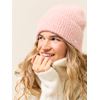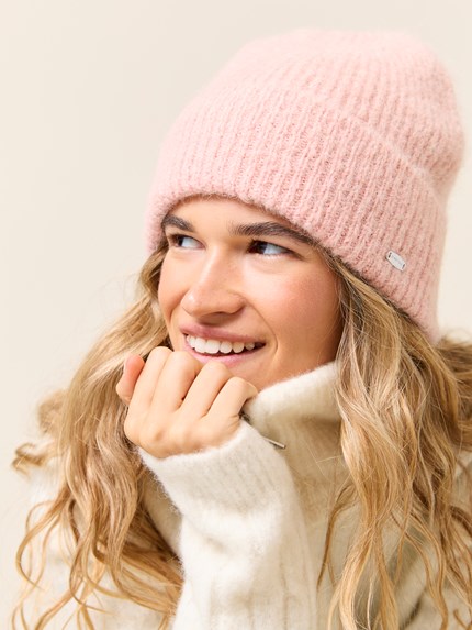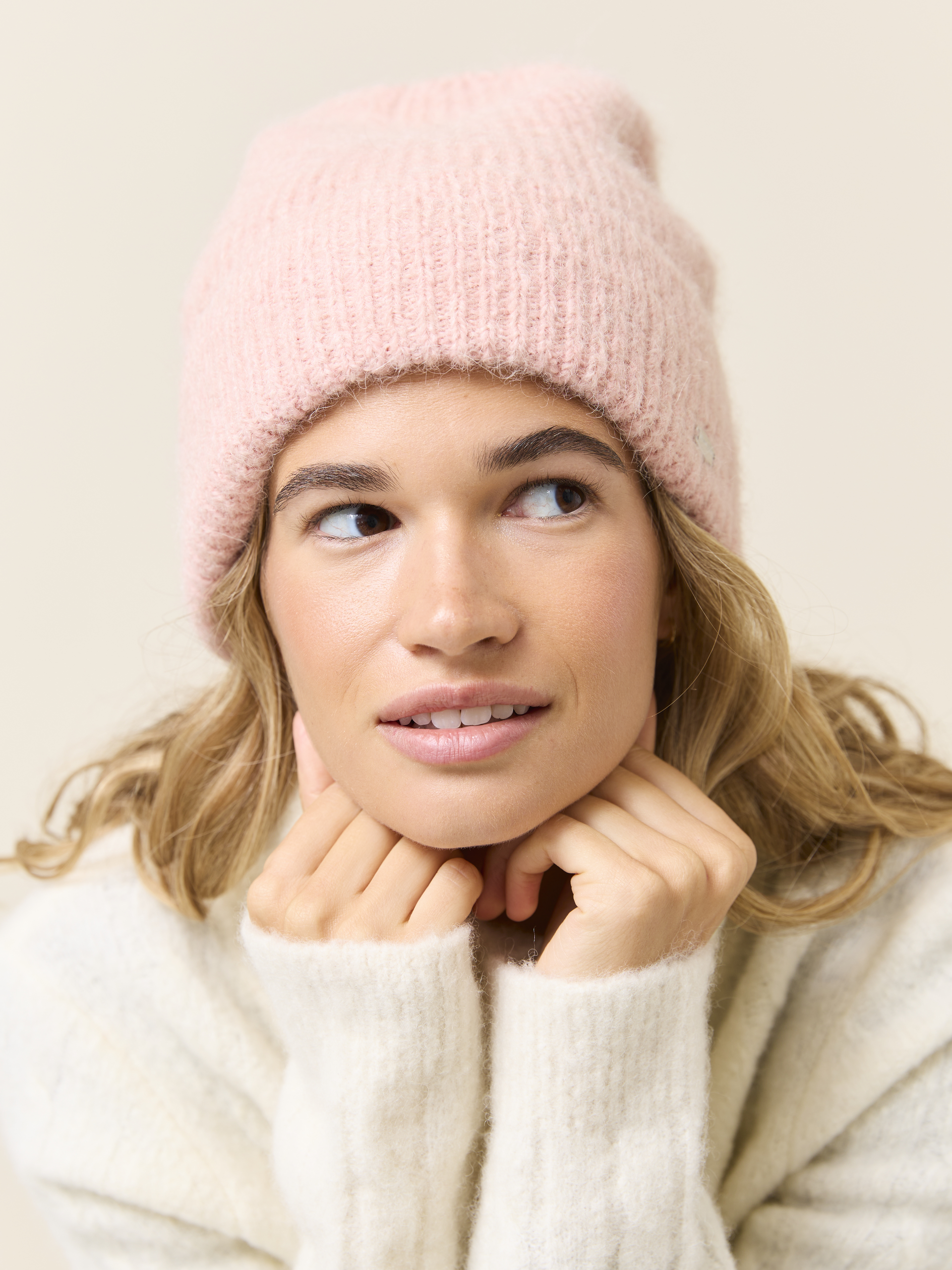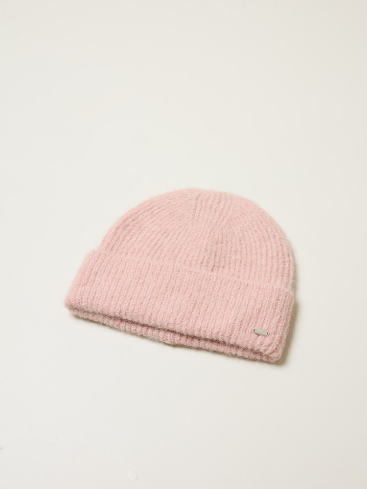 Ribbestrikket myk lue i ullblanding. Luen har oppbrett og en liten metalllogo nede på siden.