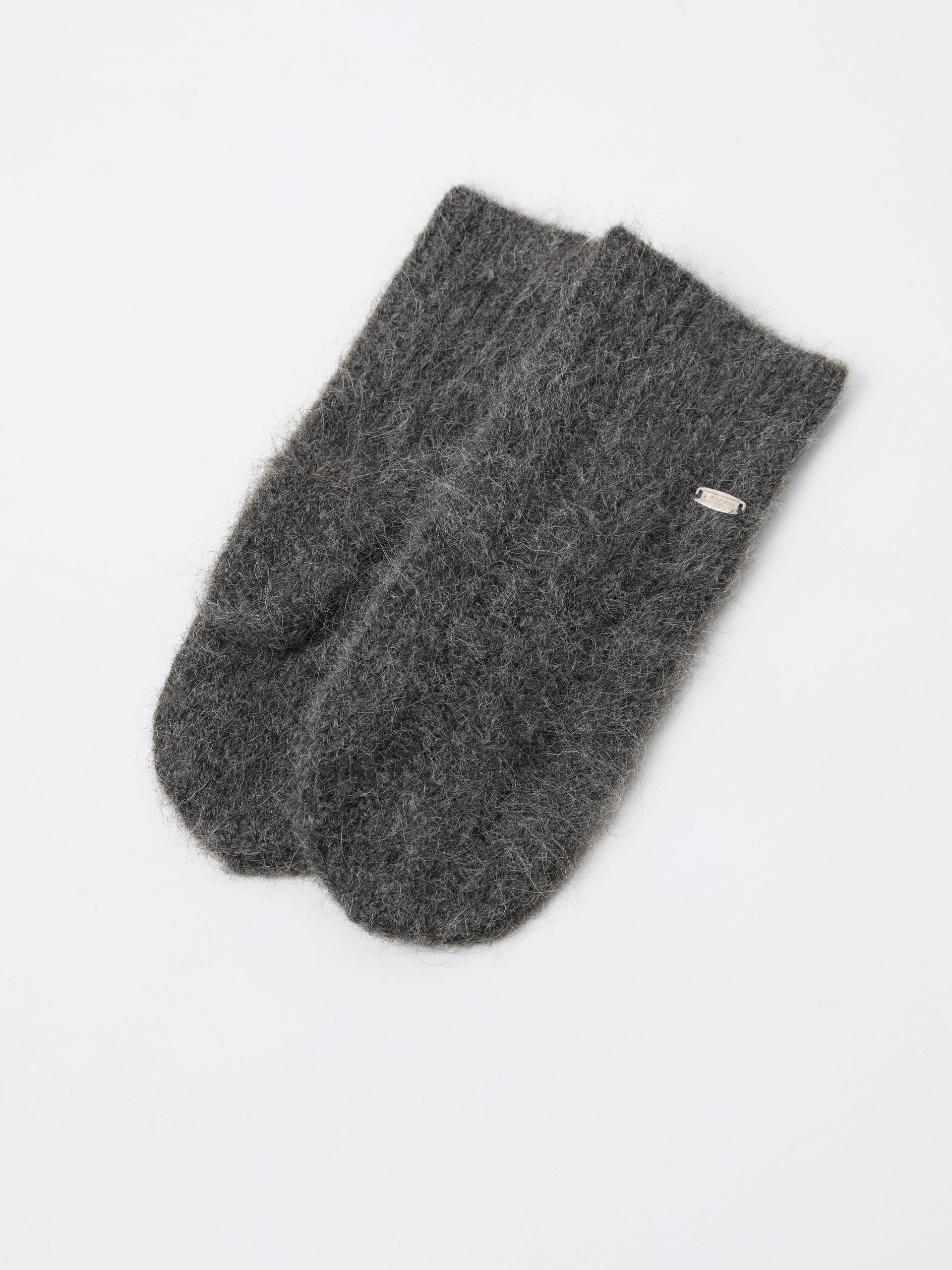 Strikket vott i myk ullblanding med flettemønster og en liten logbadge i metall.