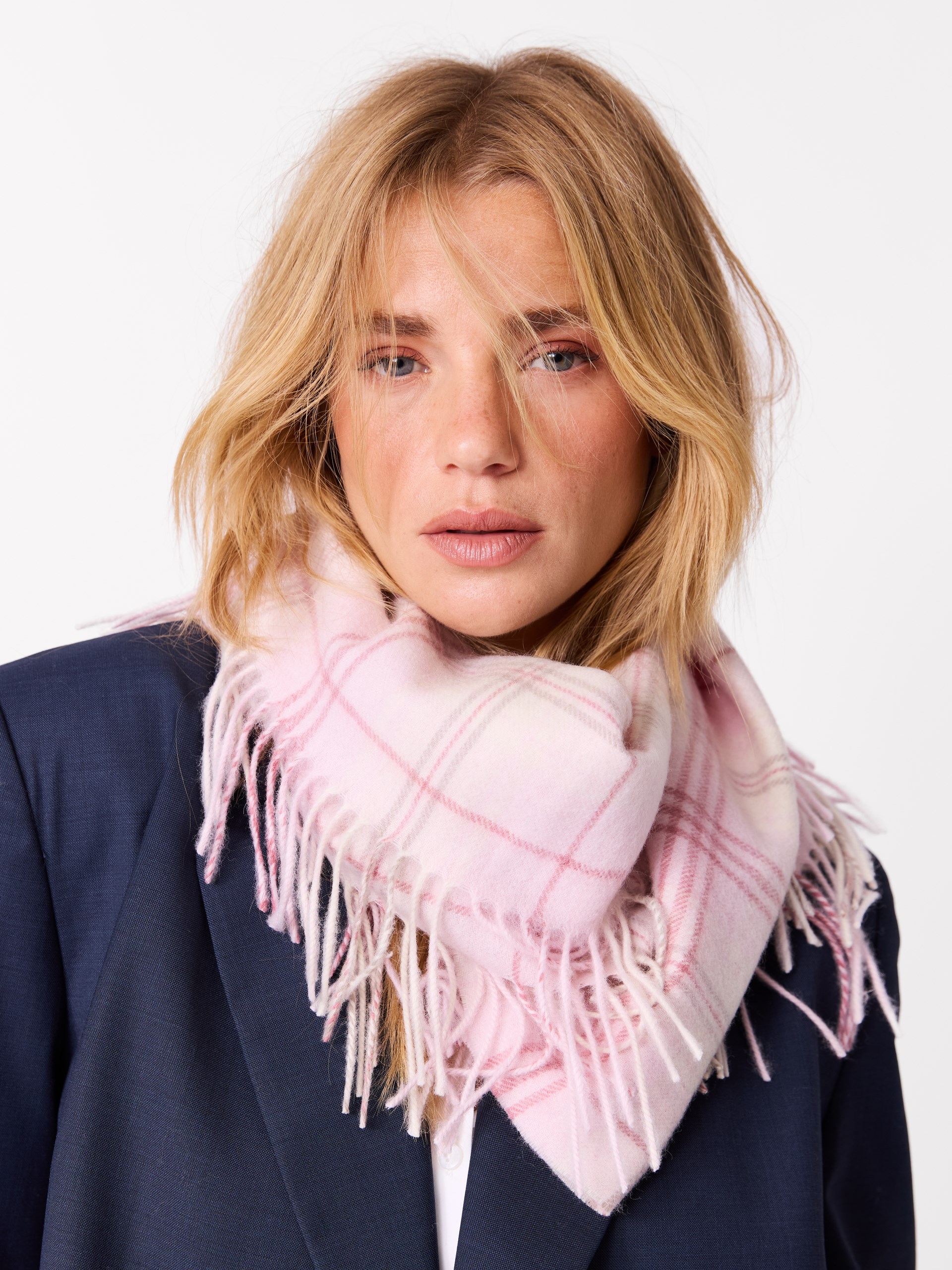 Delikat rutet skjerf i 100% myk ull. Skjerfet er 160 cm langt og 45 cm bredt og har frynser på langsidene