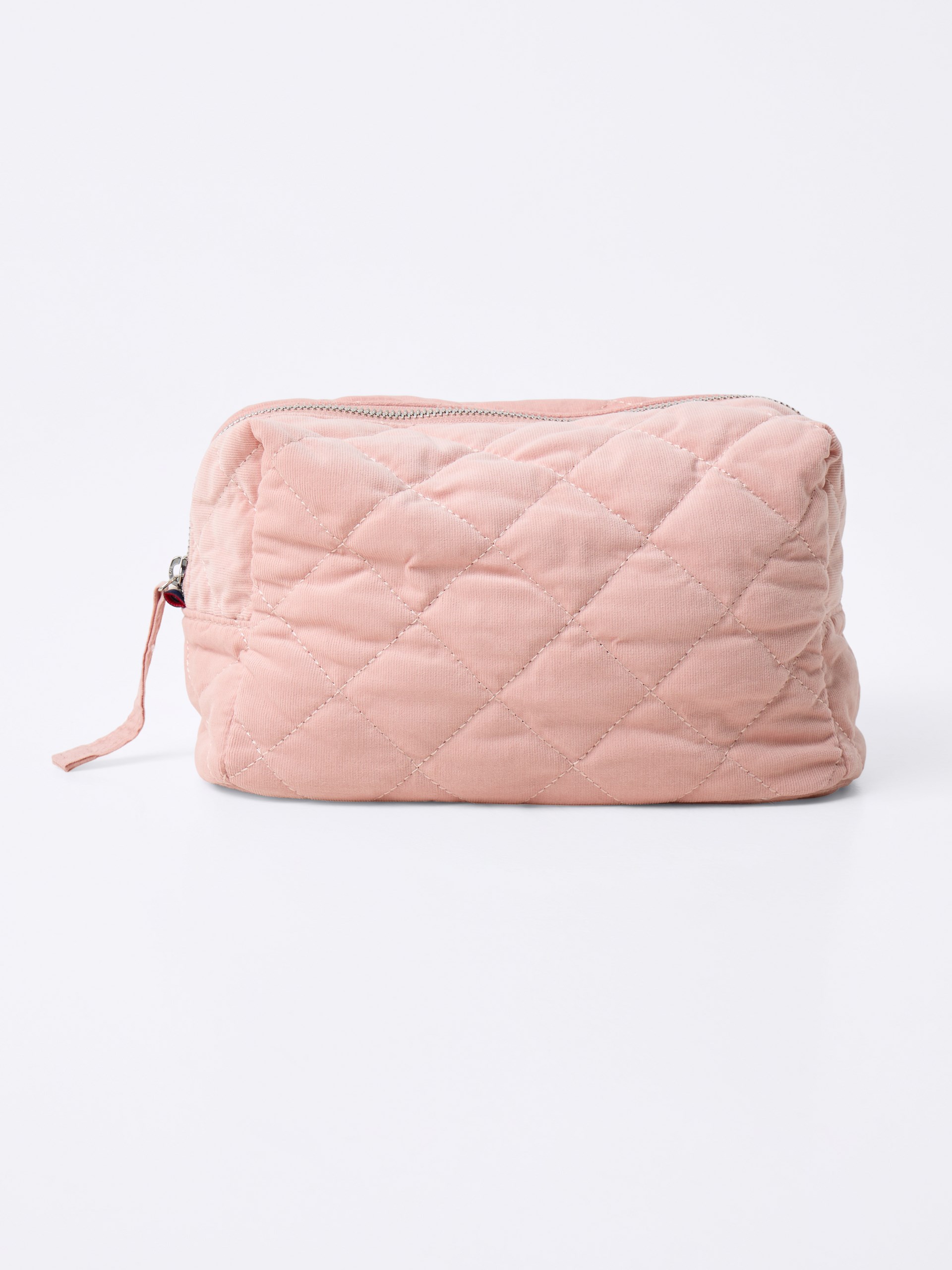 Vattert toalettmappe i delikat babycord. Mappen har innvendig lomme, lukning med metall glidelås og en liten logotab. Toalettmappen er 25 cm lang, 16 cm høy og 13 cm dyp