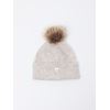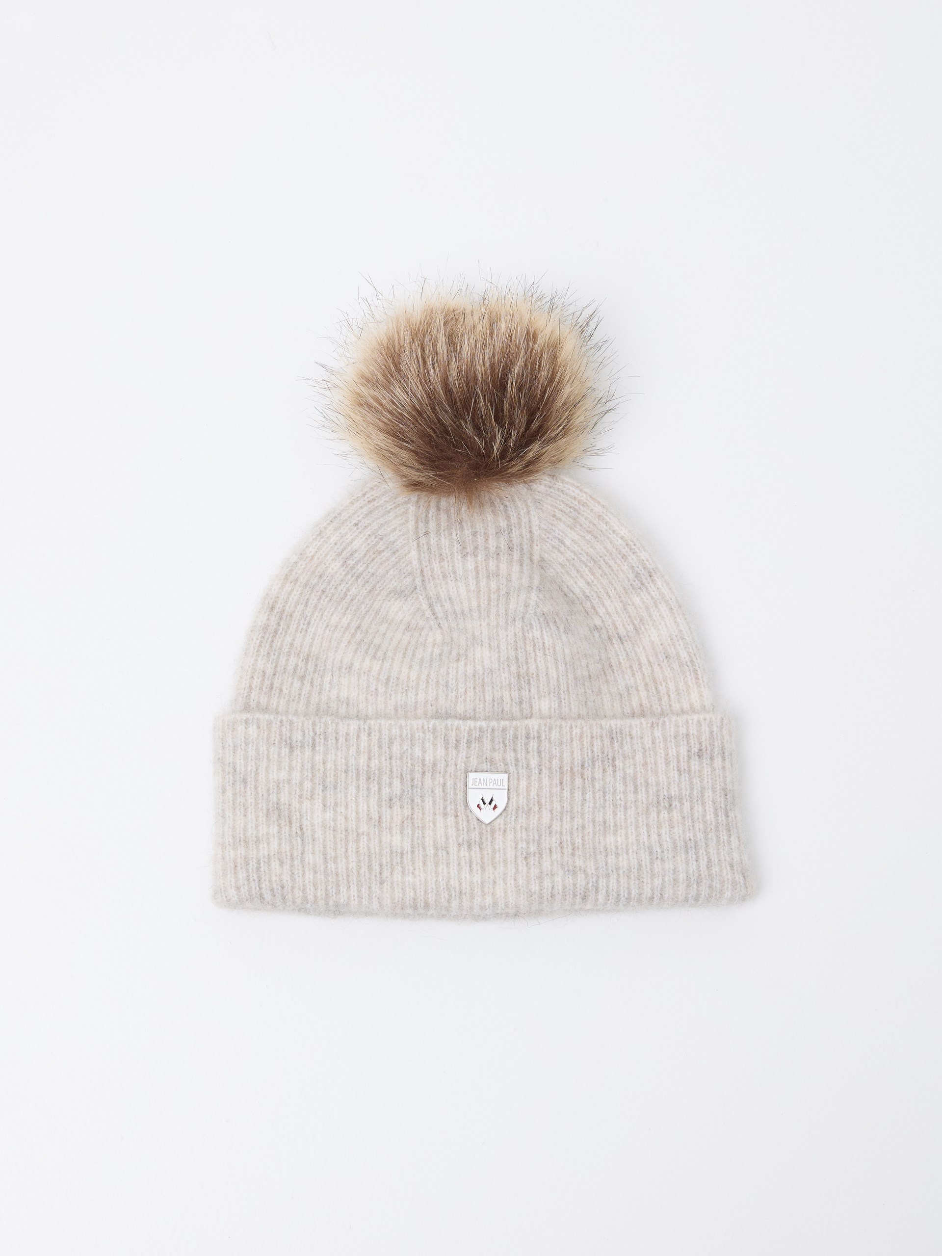 Varm og lun lue i delikat myk ullblanding. Luen har stor dusk i fuskepels, bred oppbrett og en liten metallbadge foran.